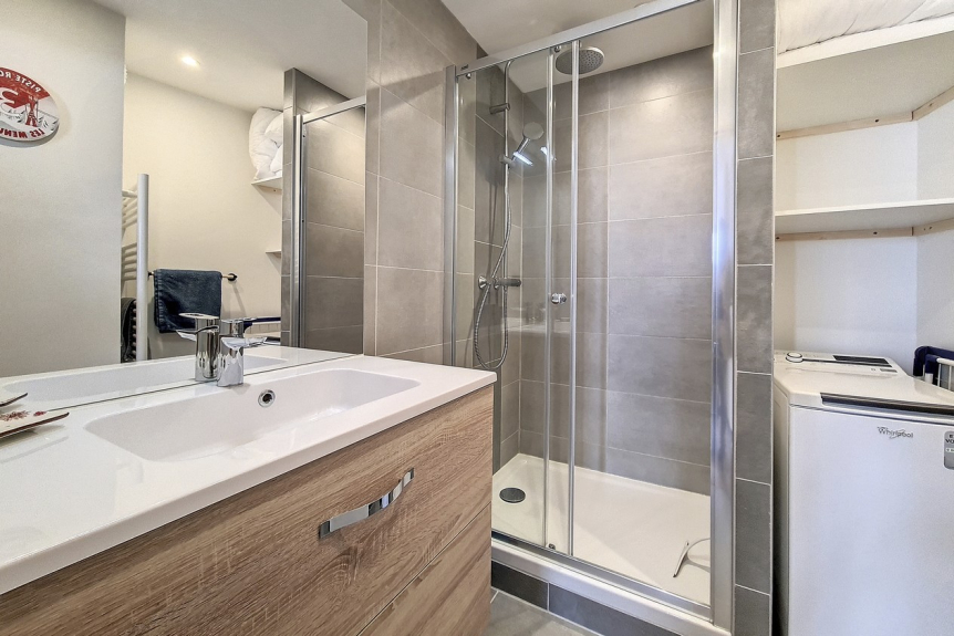 Salle de bains Douche, Machine à laver, sèche serviette électrique.