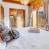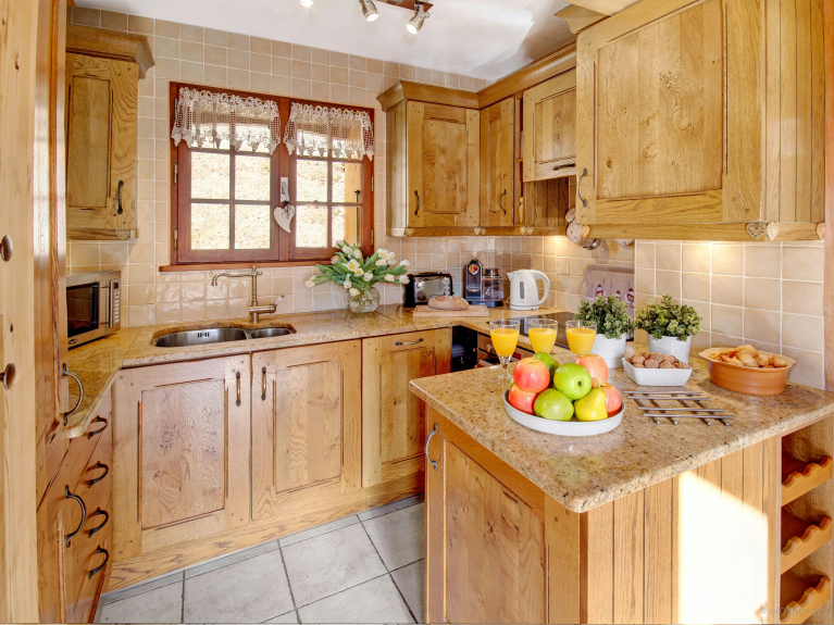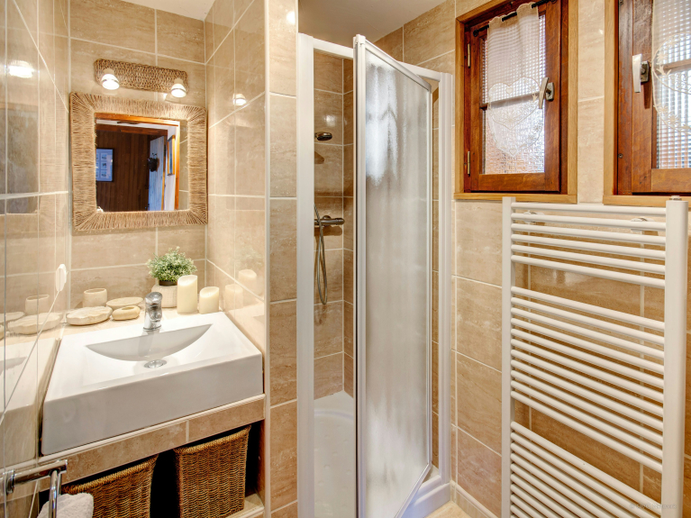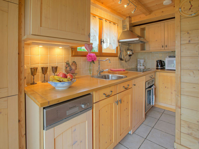 La cheminée, l'espace de vie et la salle à manger se situent à l'étage principal, tout comme la cuisine principale, petite mais parfaitement équipée. La salle de bain à cet étage dispose d’un sauna.