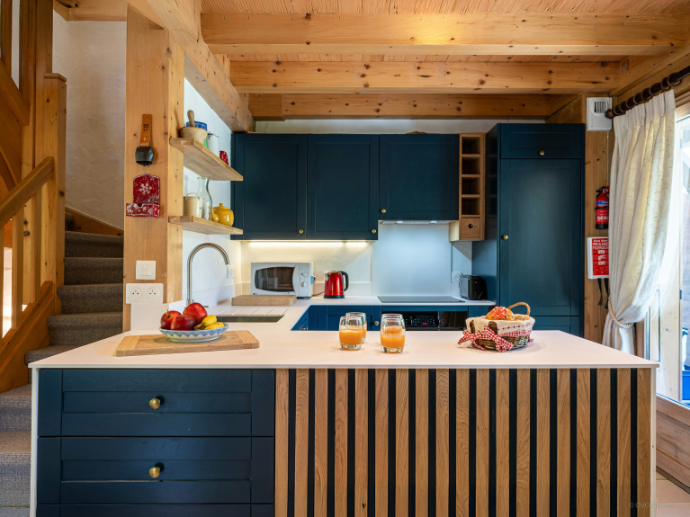 L'espace de vie principal est composé de deux espace où vous pourrez regarder la télévision ou vous détendre devant le feu de bois. Cet espace ouvert est partagé avec la cuisine bien équipée, qui donne sur la belle salle à manger.