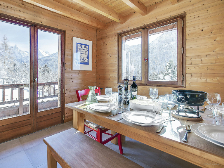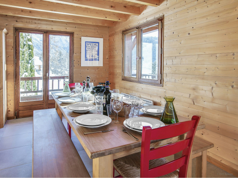 La cuisine et les salles de bains sont les parties intérieures du chalet les plus récemment restaurées. Situé dans les hauteurs et en retrait de la route entre le village de Manigod et l'Aiguille de Manigod, l'accès au village et ensuite aux pistes de ski est aisé et dégagé en hiver. Le village est à 15 minutes à pied du chalet.