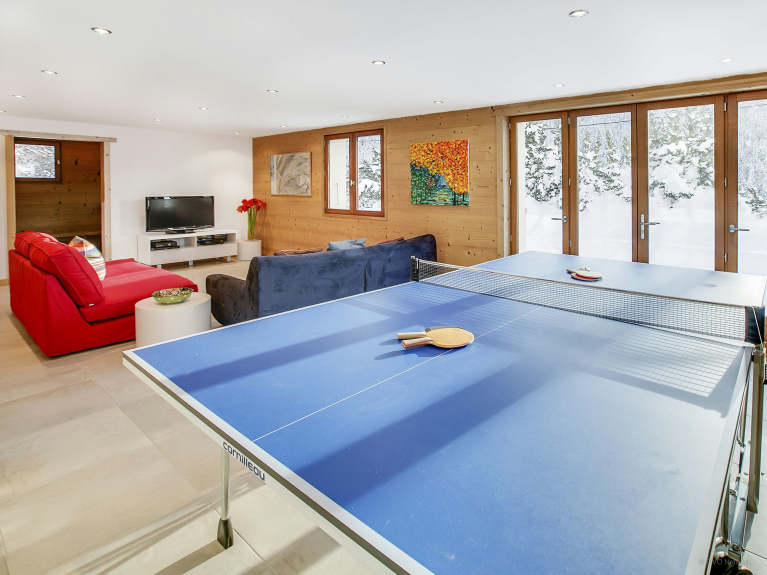 Le rez-de-chaussée est une grande pièce de détente avec tennis de table, TV, X-Box et de confortables canapés. C'est l'endroit idéal pour occuper les enfants pendant que les adultes se détendent paisiblement devant le feu de bois du salon du premier étage.