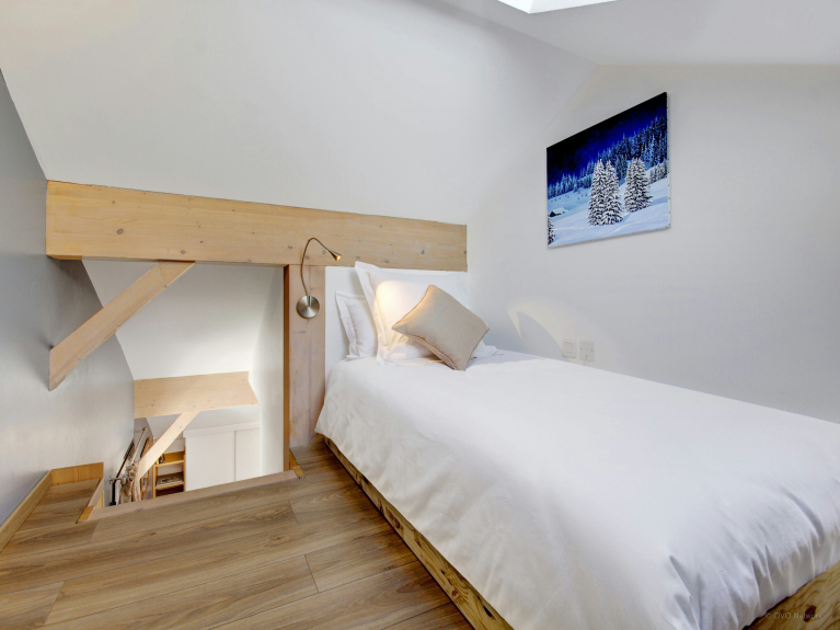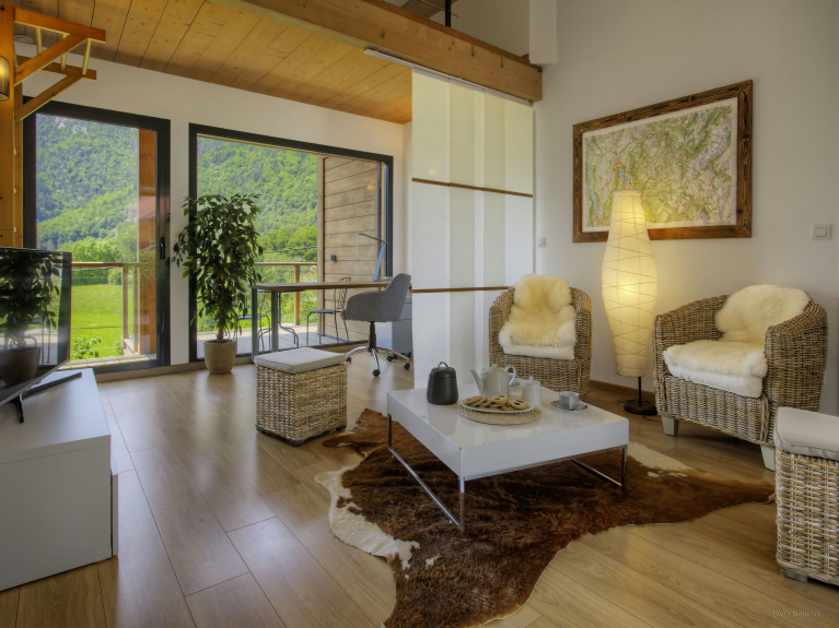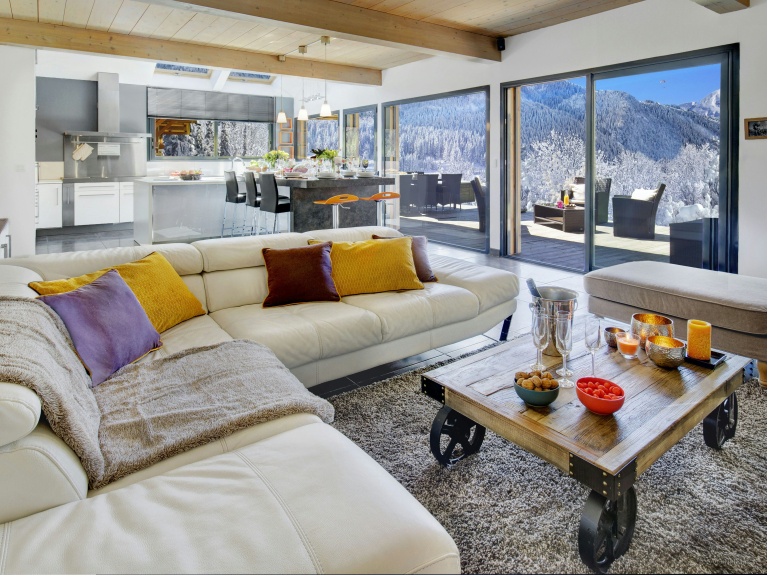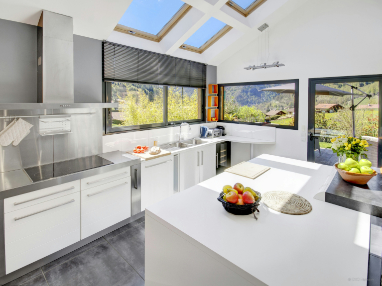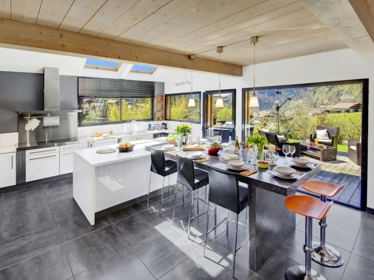 Le chalet est inondé de lumière, grâce à de hauts plafonds et de nombreuses ouvertures, faisant du chalet de Rollon un lieu contemporain et spacieux.