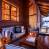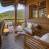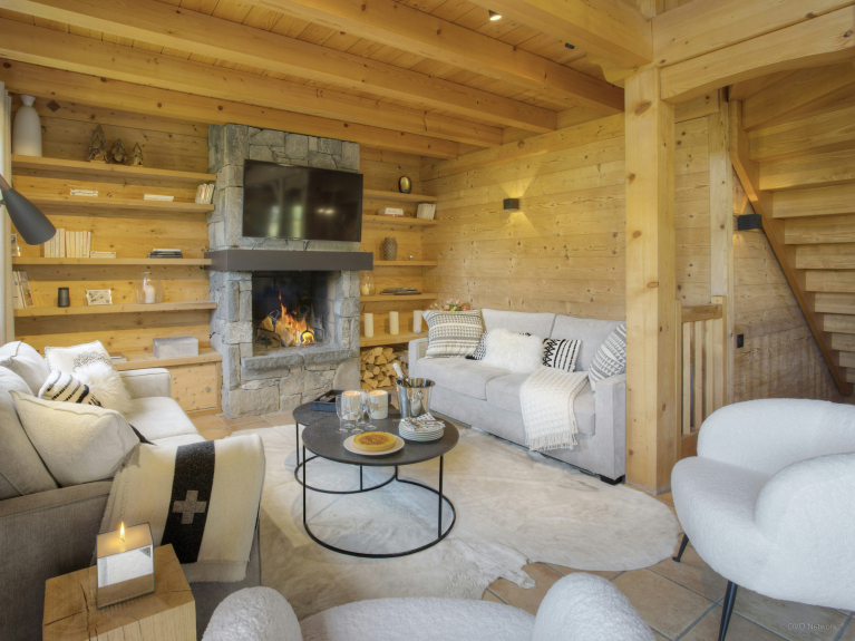 L’espace à vivre principal se compose de deux salons distincts. Le premier est situé près de la cheminée et est meublé de canapés confortables. Le second comporte des fauteuils et se trouve à côté des baies qui donnent sur la terrasse. Vous aimerez y lire en profitant de la belle lumière naturelle. La décoration est à la fois neutre et chaleureuse, et la configuration de la pièce exploite pleinement l’espace sous la charpente apparente.