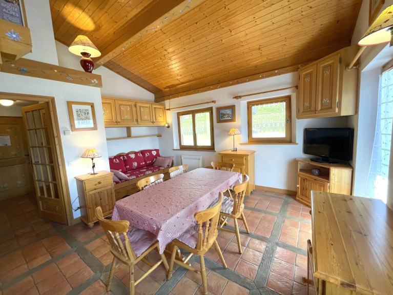 En été, vous serez non seulement à 300m des tennis et jeux pour enfants mais aussi à proximité de nombreux sentiers pour d'agréables ballades à pied ou en VTT. Le télésiège du Mont Rond, ouvert 2 jours par semaine, vous permet d'accéder facilement aux plus beaux panoramas sur le Mont Blanc. Le plan d'eau de Flumet et sa base de loisirs sont à seulement 4km.