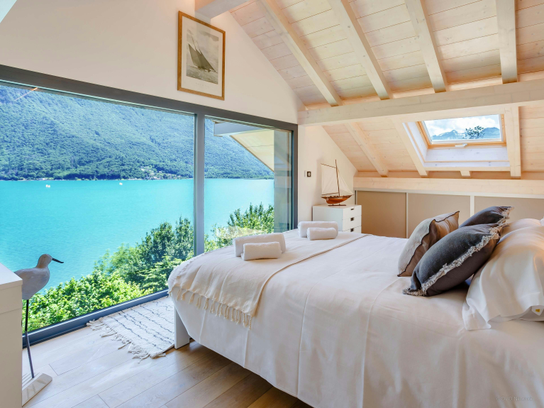 Pour le moment, la cheminée n'est pas en état de marche. Veuillez bien prendre en compte les dimensions des lits : 2 lits doubles de 140x200, 1 lit double de 180x200, et 2 lits simples de 90x200 qui peuvent être rassemblés en 1 double de 180x200. La route bordant le lac d'Annecy passe en contrebas de la propriété.
