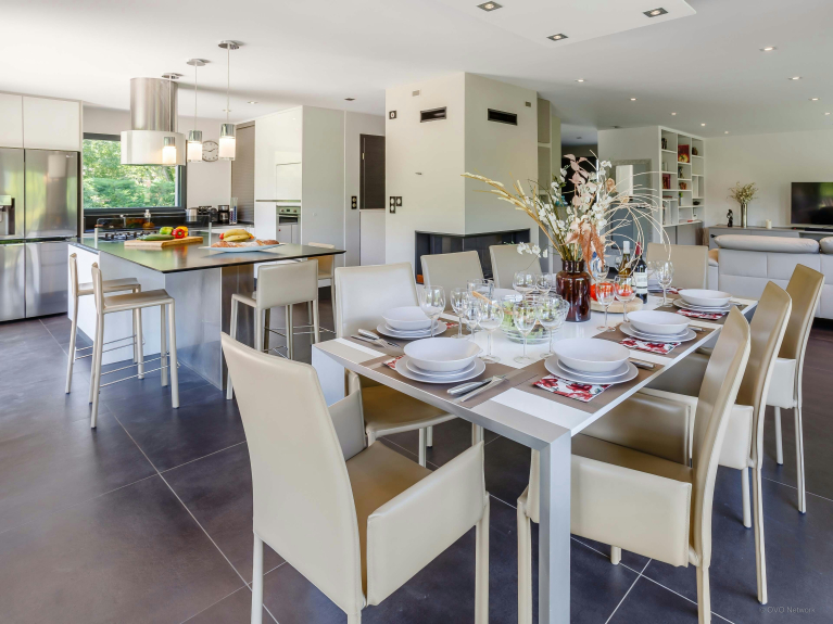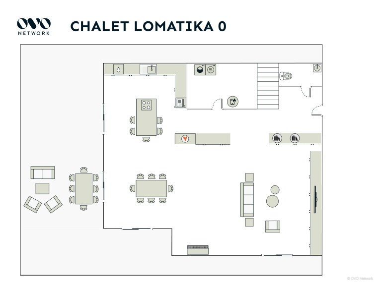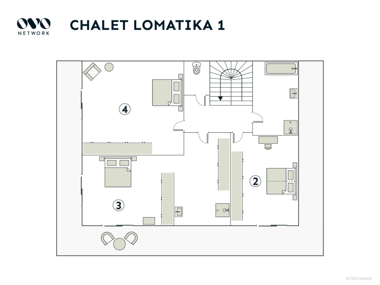 Avec quatre chambres pour deux personnes et deux salles de bain, ce chalet est suffisamment spacieux pour deux familles, ou un groupe d’amis. La maison conviendra aussi aux professionnels en déplacement, puisqu’il est possible d’installer son bureau dans divers espaces de la maison. La table de la salle à manger peut être également agrandie pour les réunions.