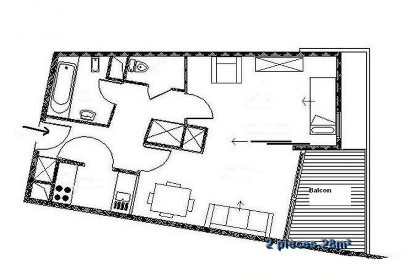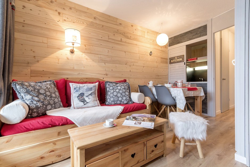 Très bel appartement de deux pièces (séparées par cloison mobile) entièrement rénové dans un style montagne de 28 m² équipé pour 4 personnes, offrant un balcon exposé SUD et vue sur chaine de montagne. Place de parking couverte incluse n°14