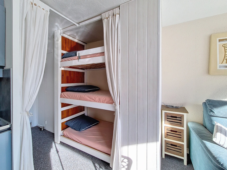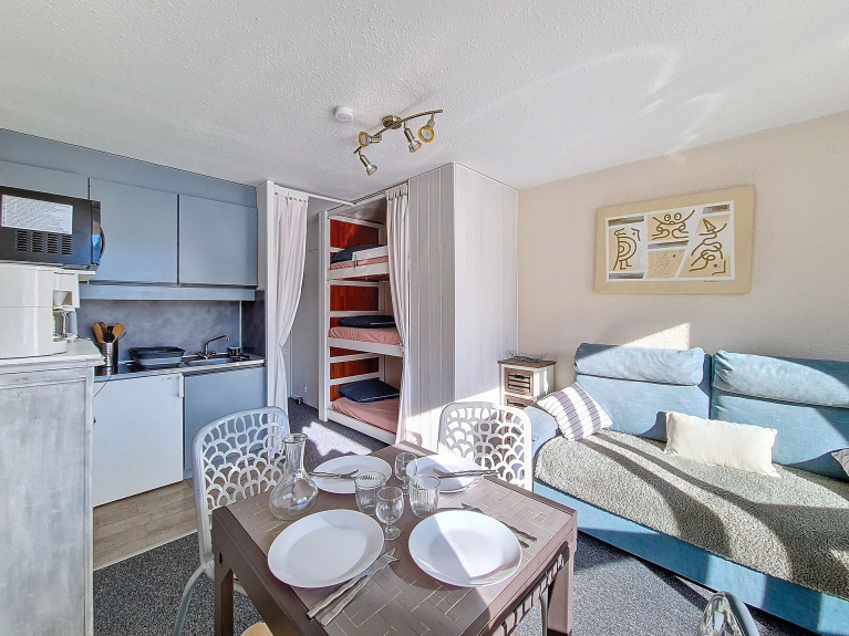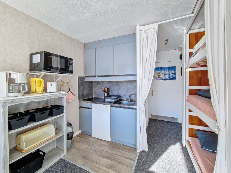 Studio de 20m² pour 3 personnes situé au 13 ème étage avec ascenseur, il a un balcon Sud. Entrée n°1
