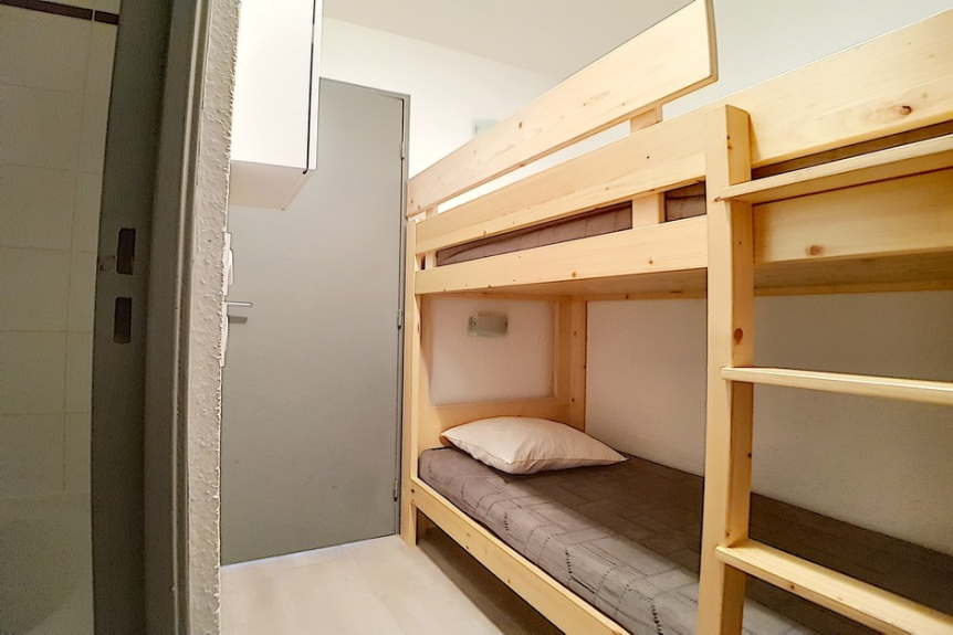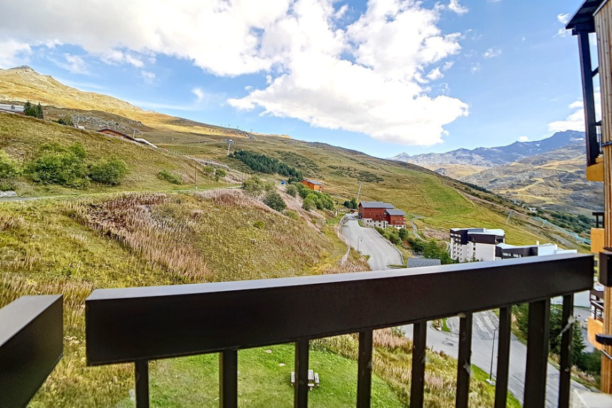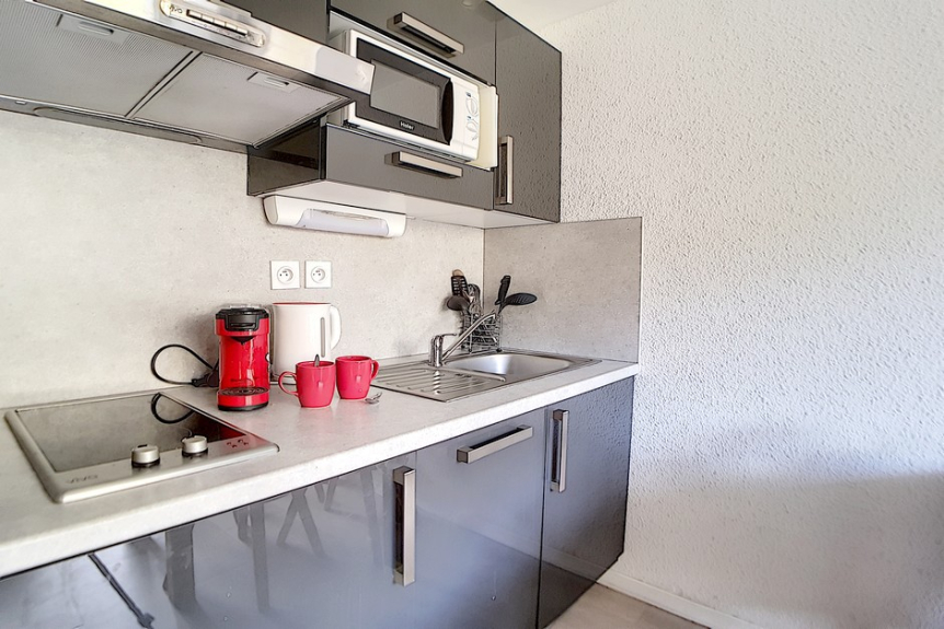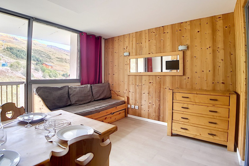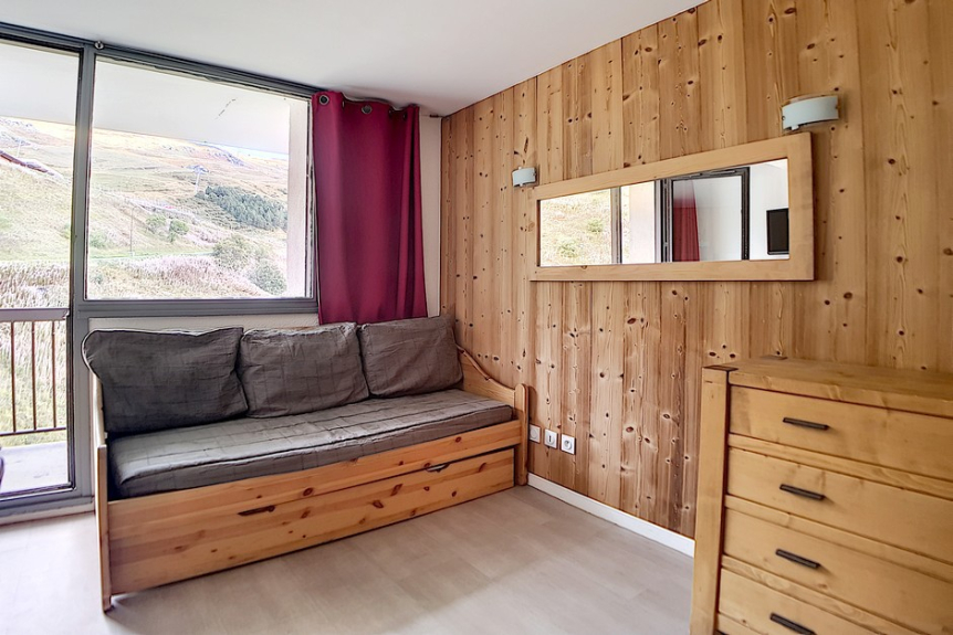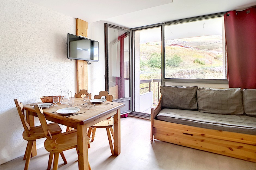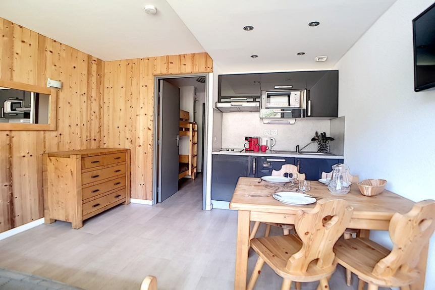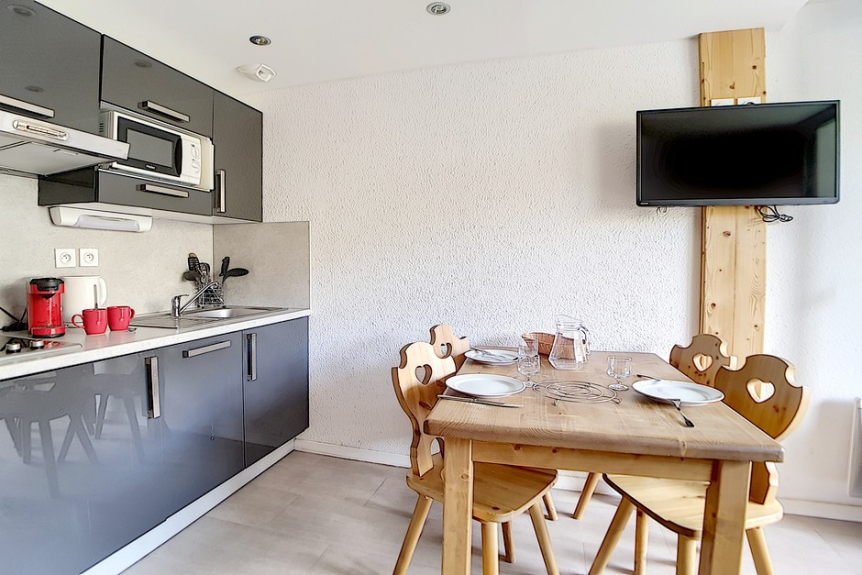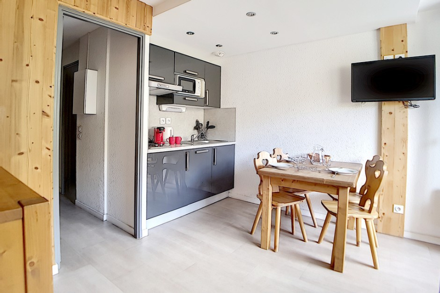 Studio avec coin montagne de 18m² pour 3 personnes. Il est situé au 4ème étage avec ascenseur et dispose d'un balcon orienté Est.