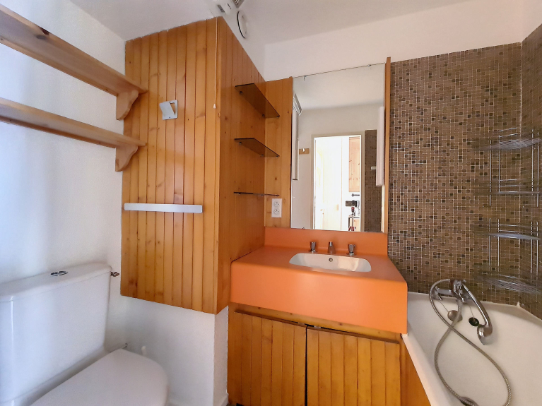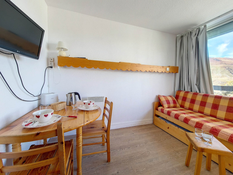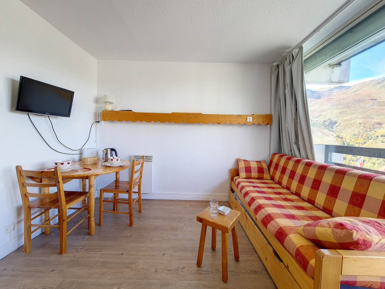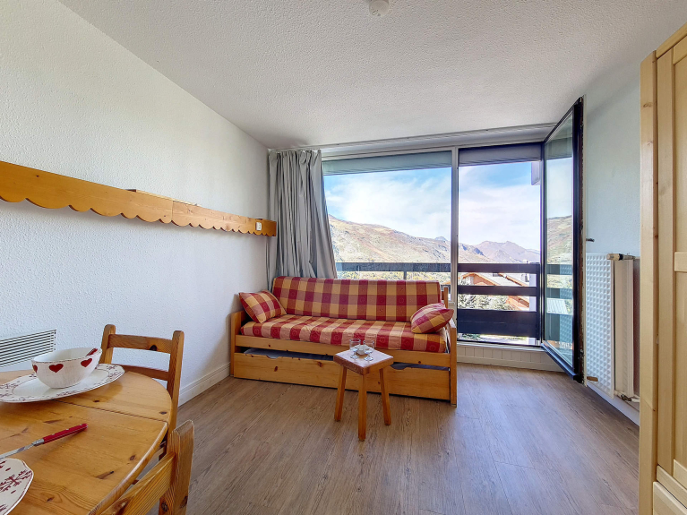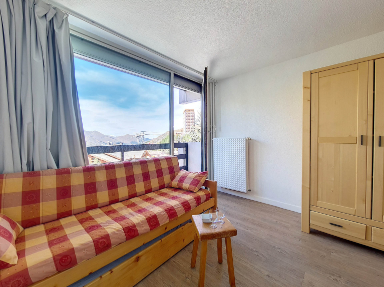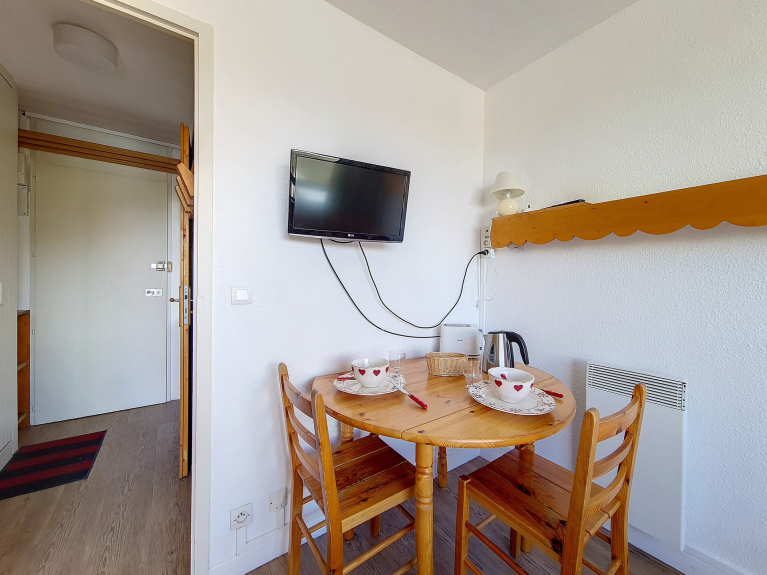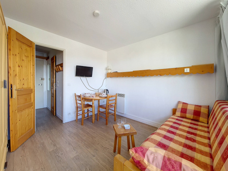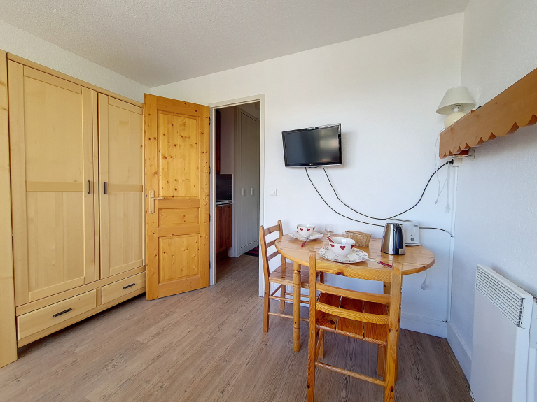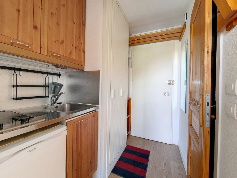 Joli studio de 17 m² pour 2 personnes. Il a un balcon OUEST et il est situé au 1er étage (rez-de-chaussée dans l'ascenseur) de l'immeuble.
