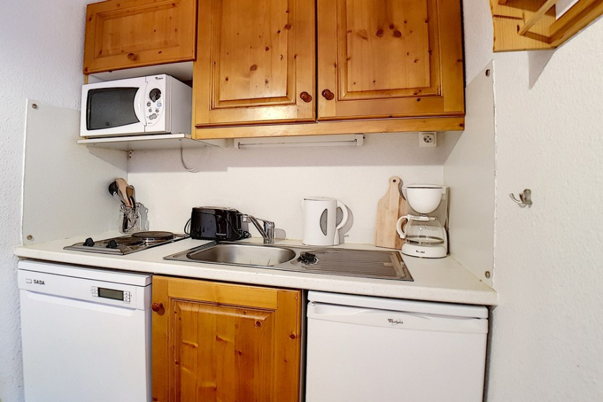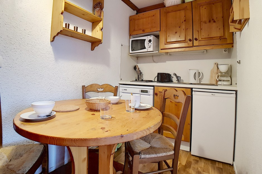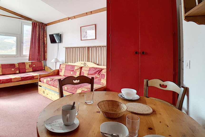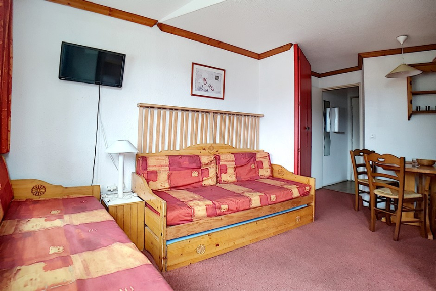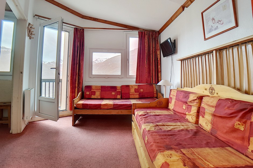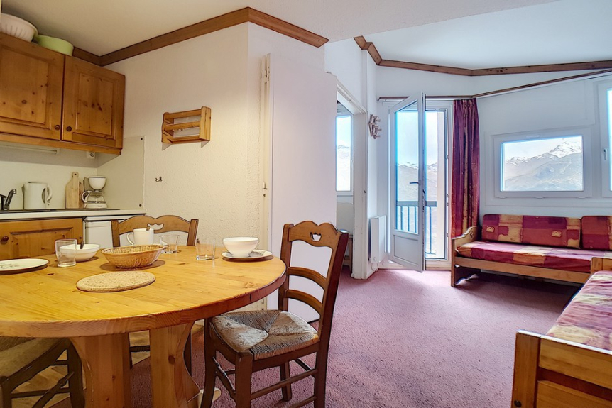 Appartement de deux pièces avec une cloison mobile de 24 m² équipé pour 4 personnes. Il est situé au 5ème étage avec ascenseur et dispose d'un balcon orienté Sud/Ouest donnant sur une très belle chaine de montagnes