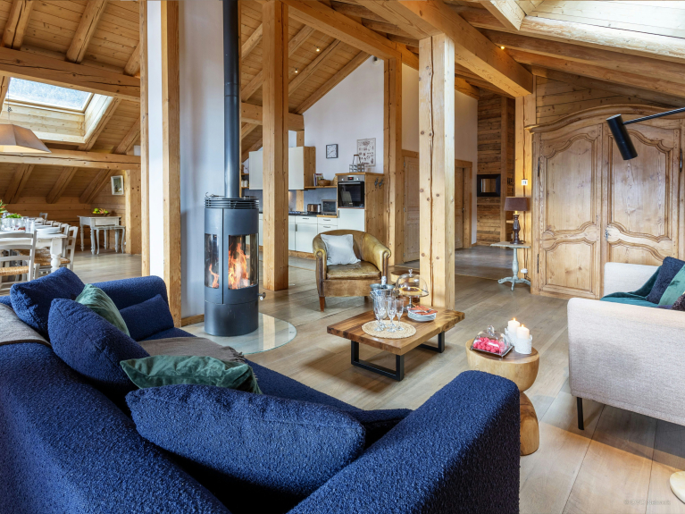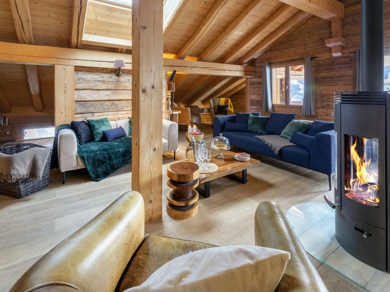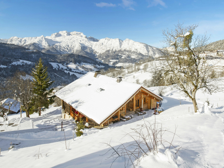 Bénéficiant d’une exposition Sud et d'une vue absolument superbe sur les montagnes, mais aussi sur le village en contrebas, cet immense chalet se compose de deux grands appartements indépendants.