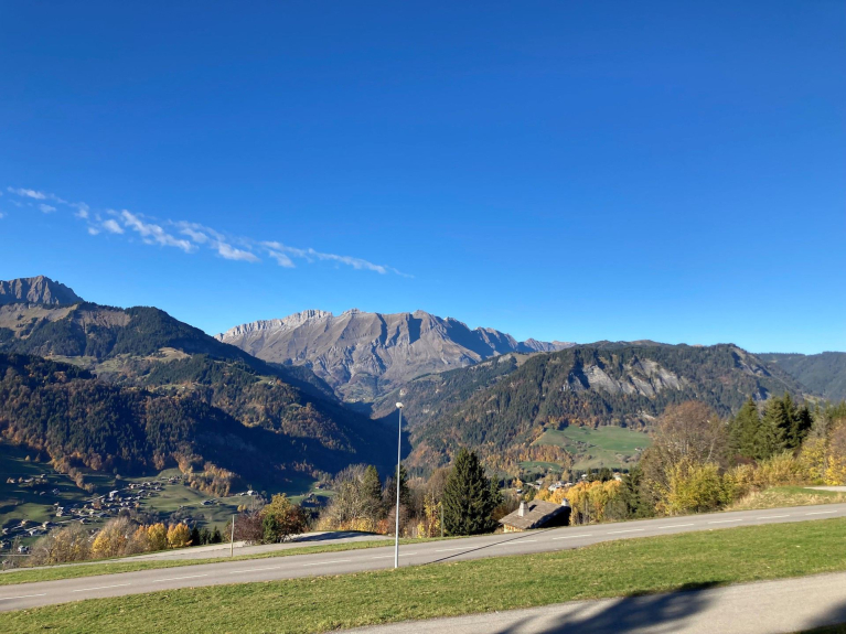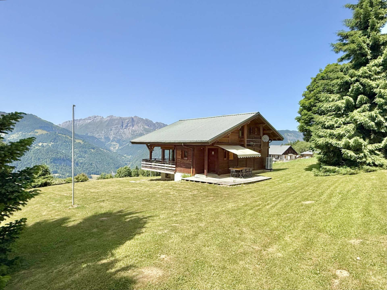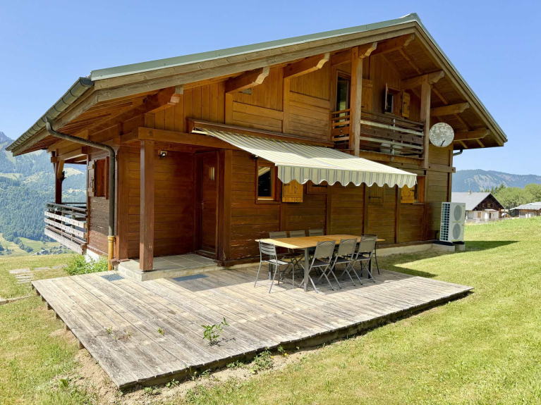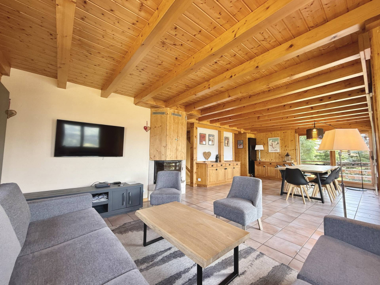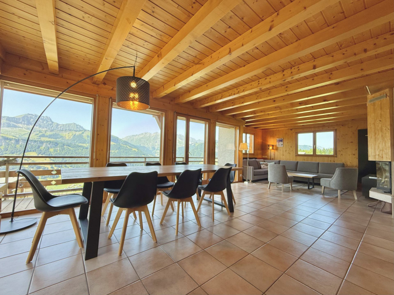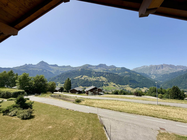 Le chalet bénéficie d'une bonne exposition et offre de somptueuses vues sur les chaines de montagnes allant du Mont Charvin à la chaine des Aravis.