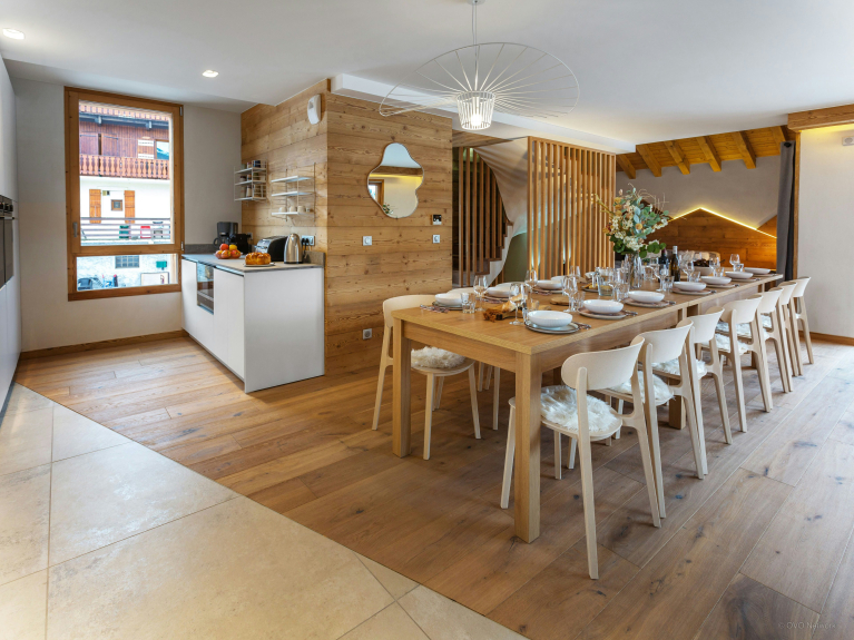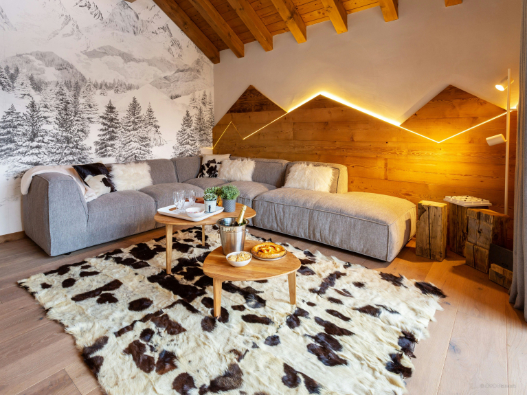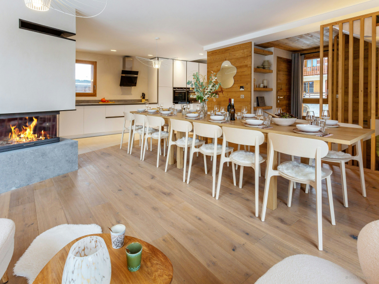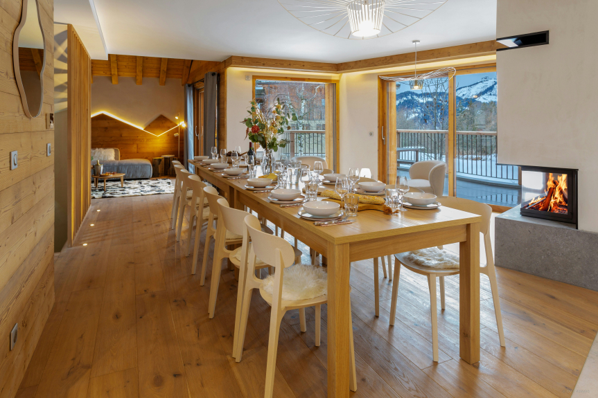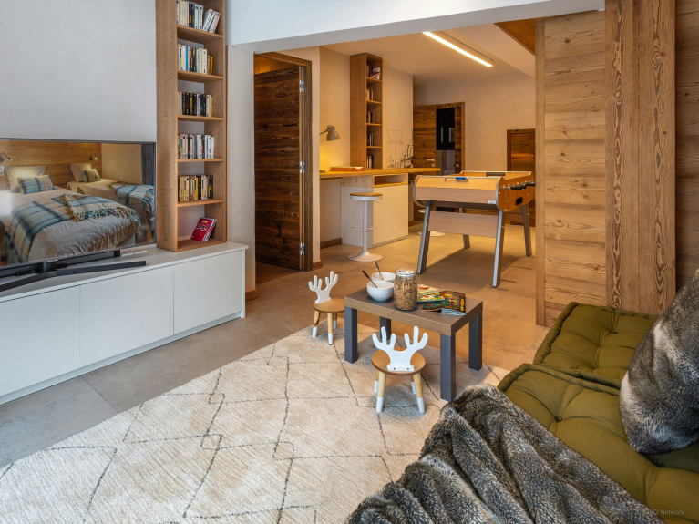 Il a été aménagé spécialement pour les familles, avec deux espaces de jeux / télévision pour les jeunes vacanciers, ainsi qu’une grande pièce de vie très lumineuse, qui inclut une cuisine équipée, un espace salle à manger avec cheminée, et un confortable salon. Des portes-fenêtres mènent de cette pièce au balcon.