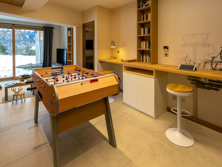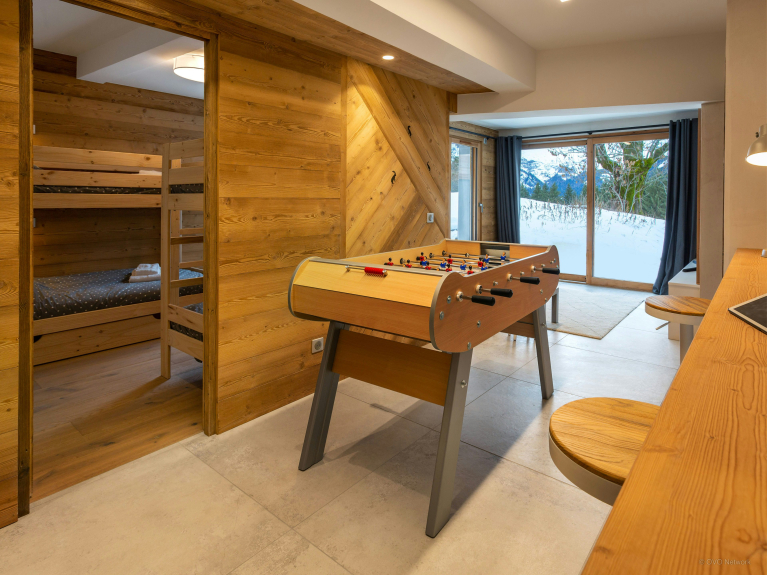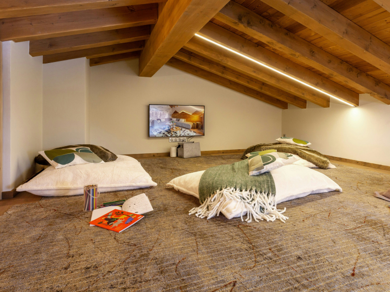 L’une des salles de jeux est au rez-de-chaussée et inclut une télévision et un accès au jardin. Dans les combles, un deuxième espace pour enfants comprend des coussins de sol, une autre télévision et un filet de jeux. Ils pourront ensuite se partager un dortoir avec quatre lits superposés, situé à côté d’une jolie salle de bains.