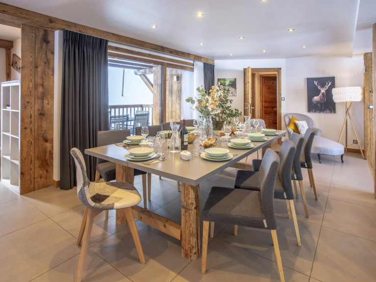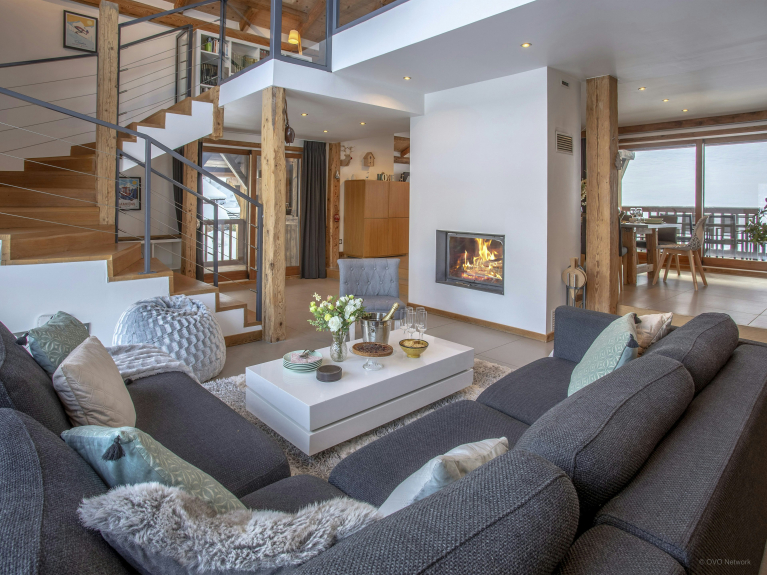 Le salon sera l'endroit idéal pour vous détendre après une journée bien remplie dans les montagnes - la lumière y pénètre par les fenêtres à double hauteur et il y a une terrasse couverte et un jacuzzi. La cuisine est suffisamment spacieuse pour y concocter de bons petits plats, et le bar du petit-déjeuner est idéal pour les repas des enfants. Le coin repas est séparé de l'espace séjour par une cheminée centrale, ce qui rend les deux parties chaleureuses !