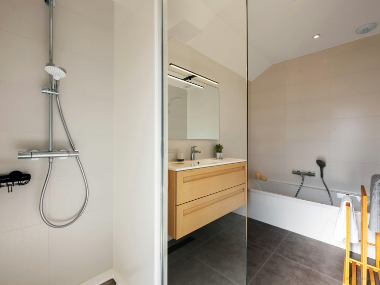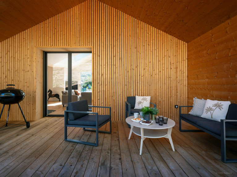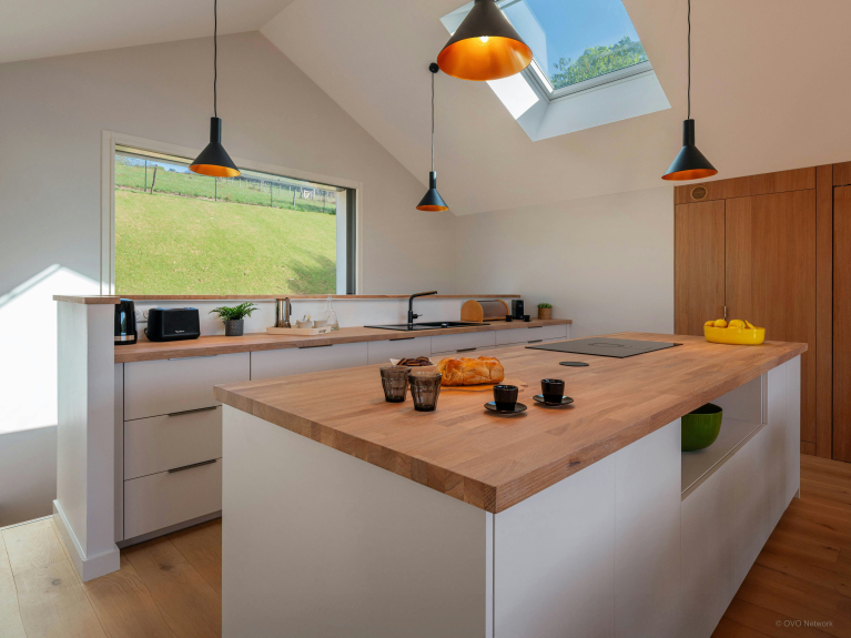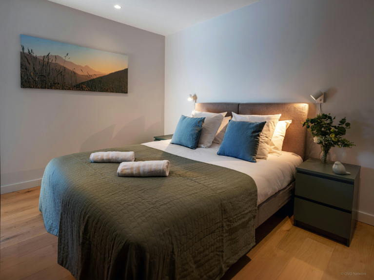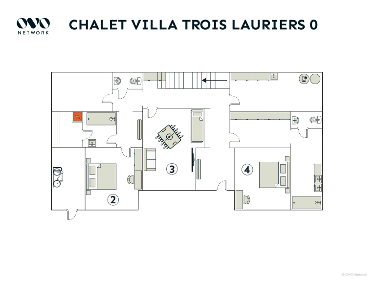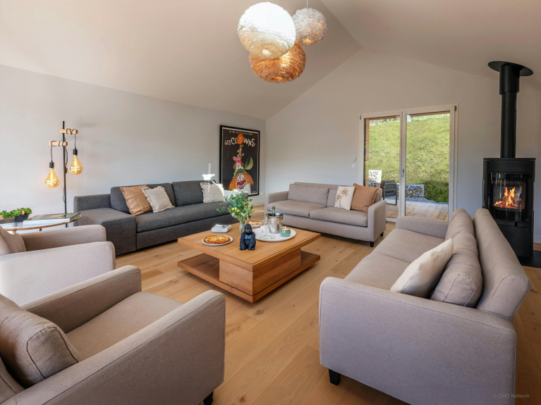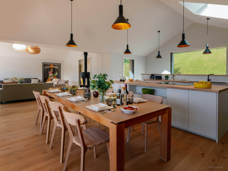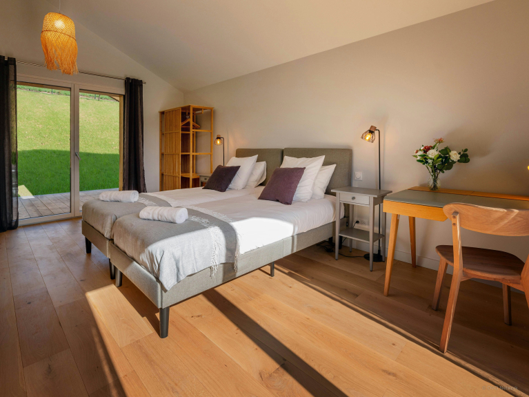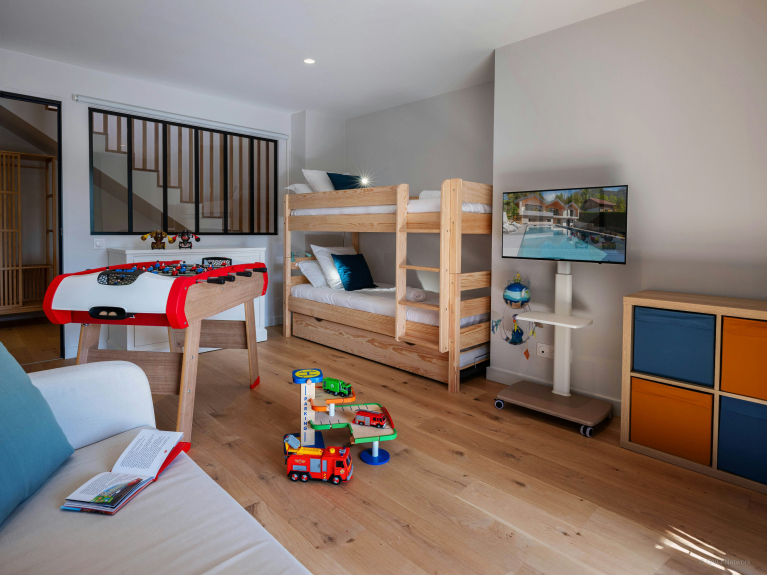 La propriété est à la fois somptueuse et fonctionnelle. Elle compte 3 chambres doubles (dont 2 suites), un remarquable dortoir pour les enfants, avec livres, jeux, télévision et babyfoot, un confortable salon avec poêle à bois, une belle terrasse, et une piscine extérieure.