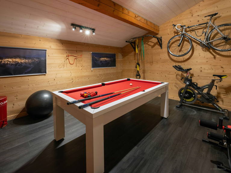 Le garage couvert a été converti en salle de sports, jeux et détente, où vous pourrez également ranger vos vélos. En cas de besoin, vous pourrez stationner jusqu’à 4 voitures à l’extérieur du chalet.
