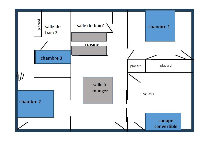 3 chambres (2 lits double et 1 lit superposé) + 1 canapé convertible dans salon