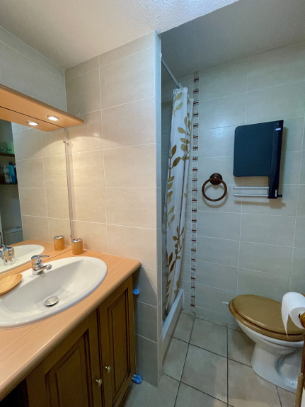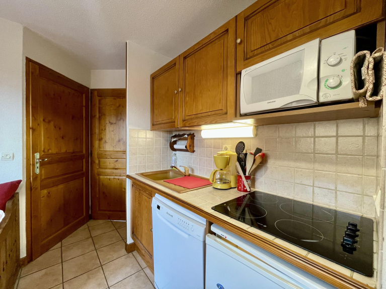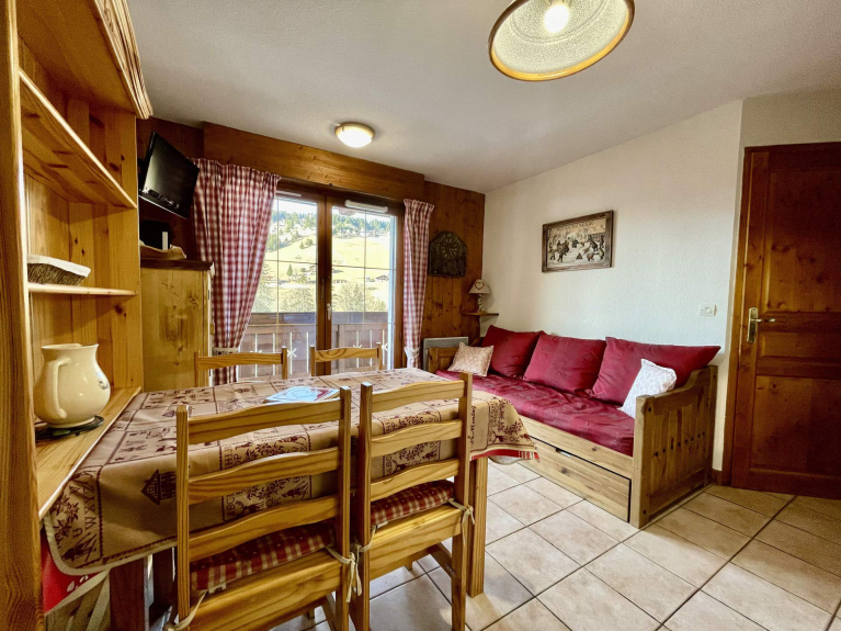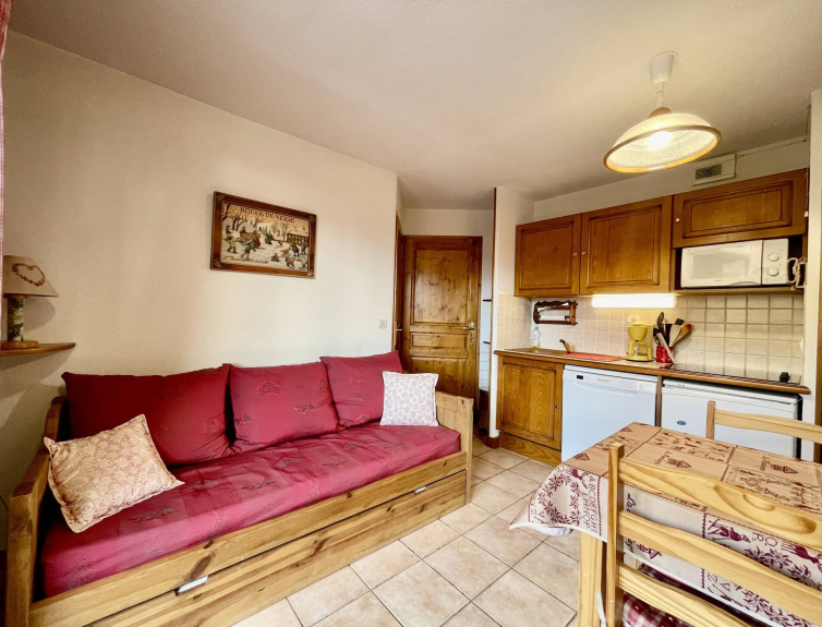 Appartement de 33m² avec cinq couchages au premier étage d'une résidence au pied des pistes de l'Espace Diamant. Il bénéficie d'un balcon en exposition nord avec vue sur le Mont Charvin et la vallée.