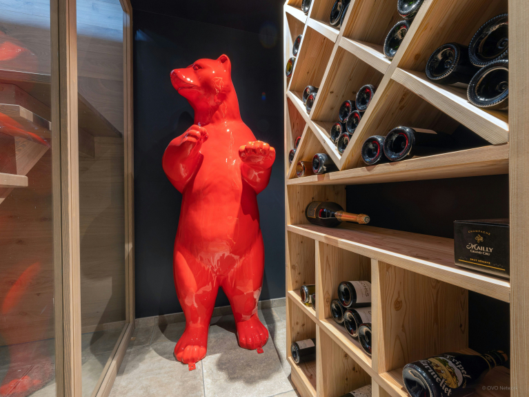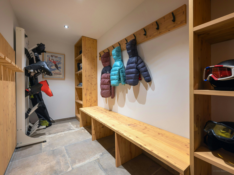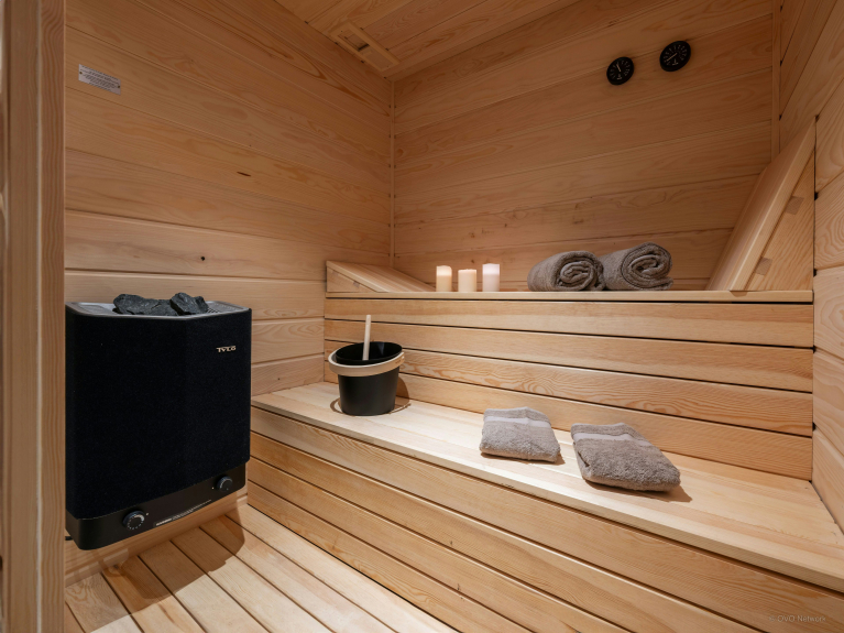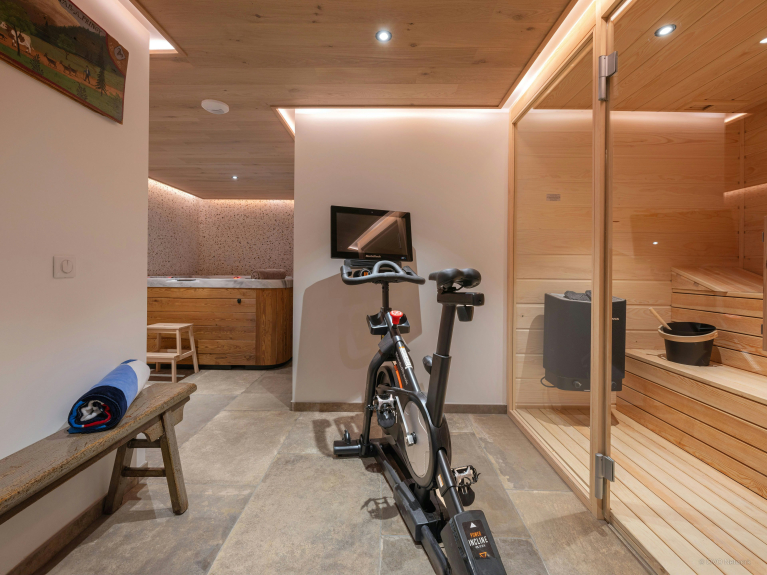 L’espace bien-être se situe au rez-de-jardin et inclut un sauna, un jacuzzi et une douche, ainsi qu’un vélo d’appartement et un tapis roulant. Cet étage dispose également d’un local à skis avec sèche-chaussures chauffant, d’une cave à vins (accessible uniquement sur demande avant l'arrivée), et d’une buanderie avec lave-linge et sèche-linge.