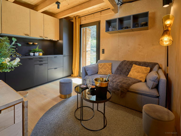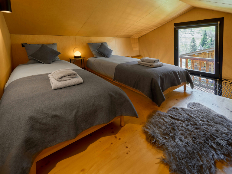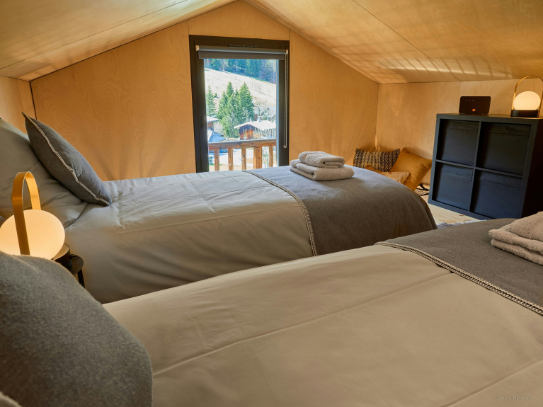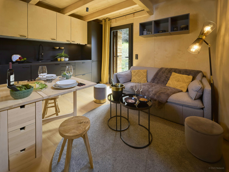 Le chalet Sideflip est compact et fonctionnel, offrant à une famille de quatre personnes tous les équipements disponibles dans un grand chalet. Attention, l’accès à la mezzanine par une échelle n’est pas recommandé aux jeunes enfants, mais les adolescents adoreront cet espace, qui est équipé d’un filet permettant d’observer la pièce du dessous.