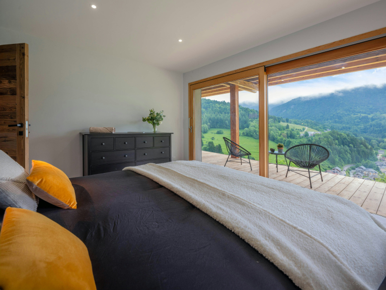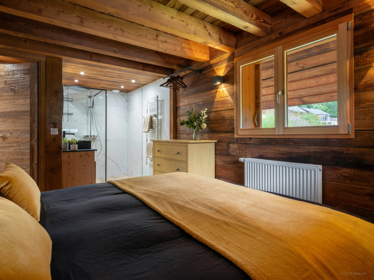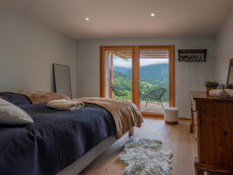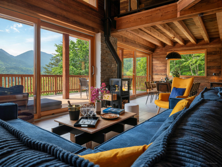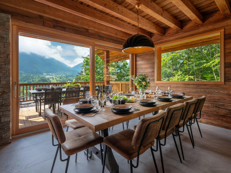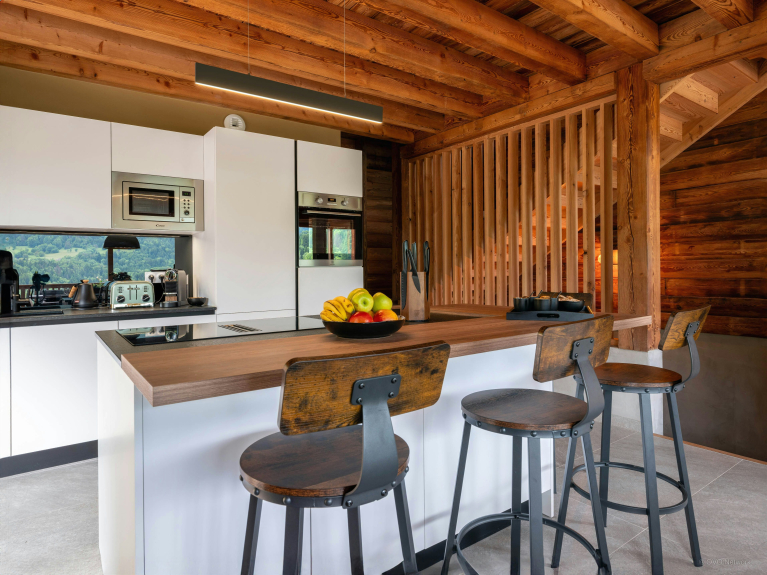 L’entrée du chalet mène à une agréable pièce de vie, dont les baies vitrées coulissantes surplombent le village et son clocher traditionnel. Vous y trouverez une cuisine équipée avec un comptoir central, une grande table à manger, et un salon confortable muni d’un poêle à bois. En prolongement de cette pièce, la terrasse aménagée propose un salon de jardin avec une seconde table à manger et un barbecue, et des chaises longues pour vos moments de farniente.