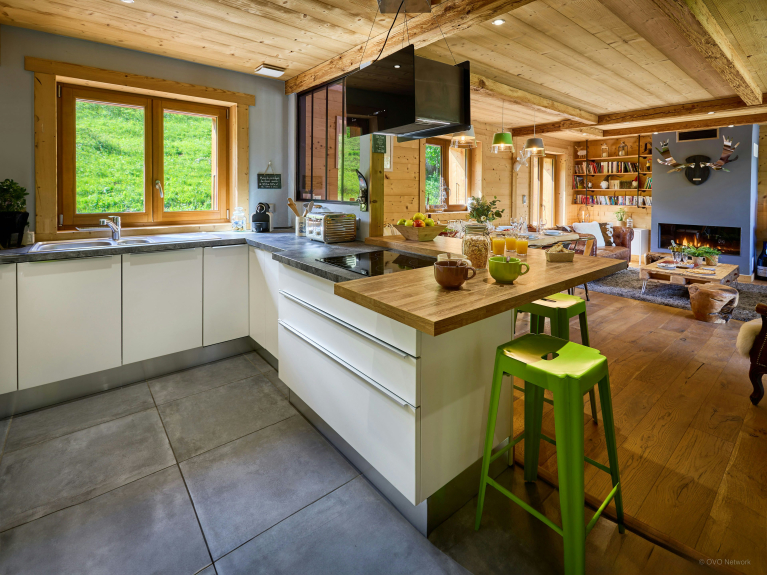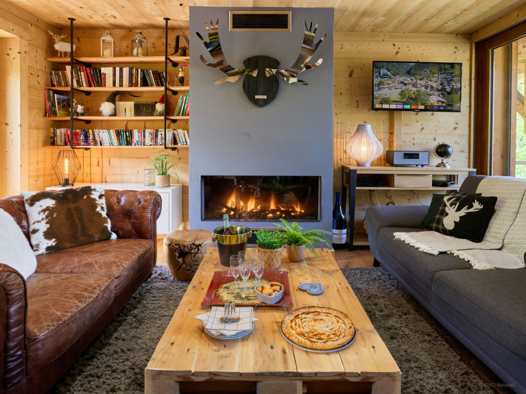 La pièce de vie ouverte comprend une cuisine équipée, une table à manger spacieuse, et un coin salon confortable avec deux canapés et une télévision. Une cheminée à gaz crée une atmosphère chaleureuse. Des portes-fenêtres donnent d’un côté sur la terrasse couverte, et de l’autre sur le balcon, d’où vous pourrez observer la danse des remontées mécaniques.