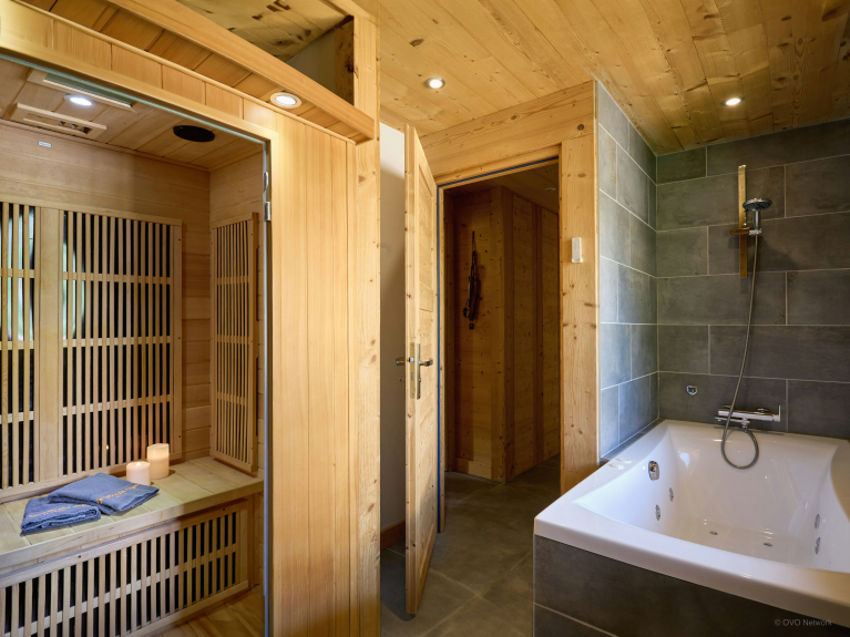 Cet étage comprend un espace bien-être, composé d’un sauna et d’un bain à remous, ainsi qu’une chambre double avec salle de douche privée, et enfin des toilettes séparées.