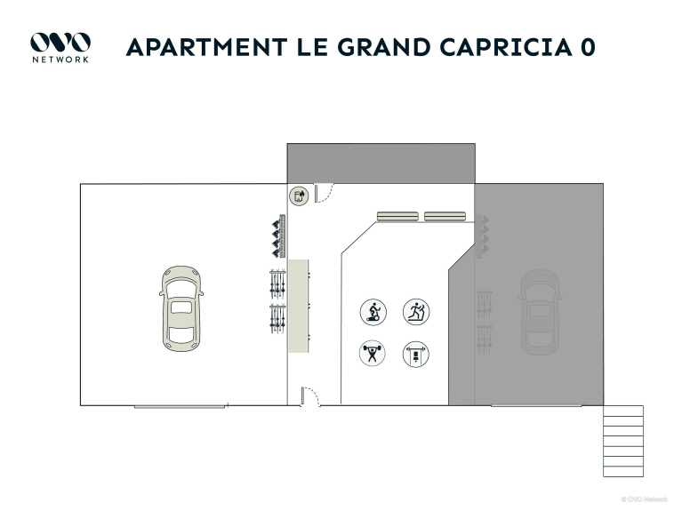 Cet appartement occupe les deux étages supérieurs d’un immeuble qu’il partage avec Le Petit Capricia. Au rez-de-chaussée se trouvent le garage (pour un ou deux petits véhicules), le local à skis, et la salle de sport.