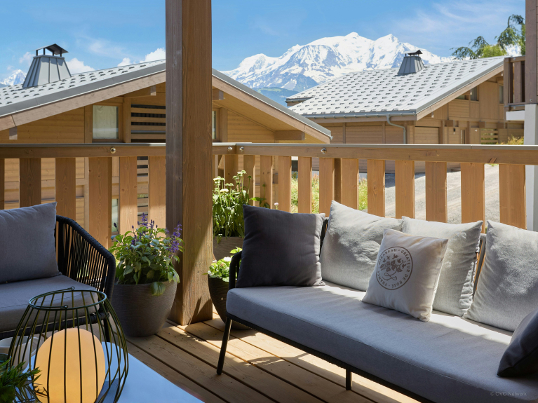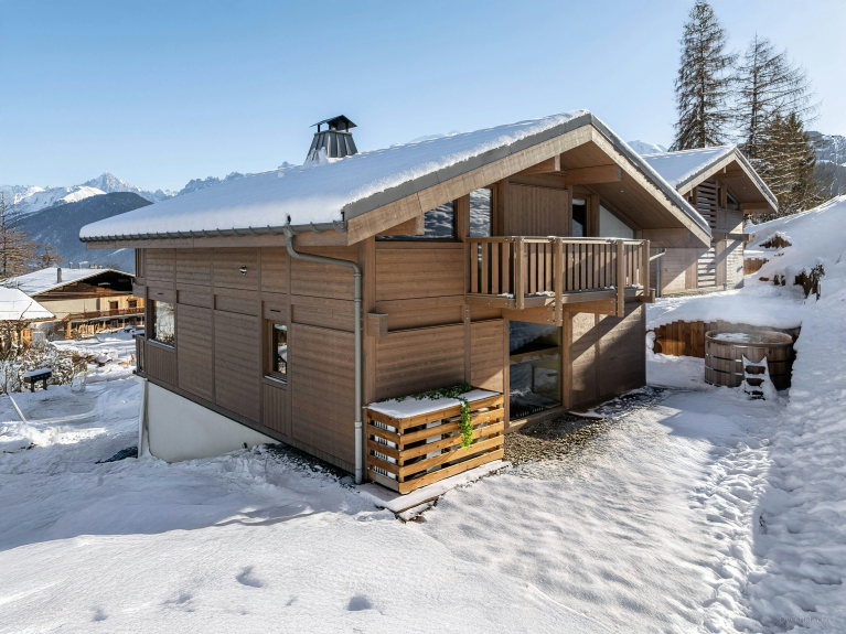 La vaste terrasse propose un coin salon abrité, une deuxième table à manger, un terrain de pétanque et un bain nordique, sorte de jacuzzi sans bulles. C’est l’endroit idéal pour admirer la silhouette charismatique du massif du Mont-Blanc.