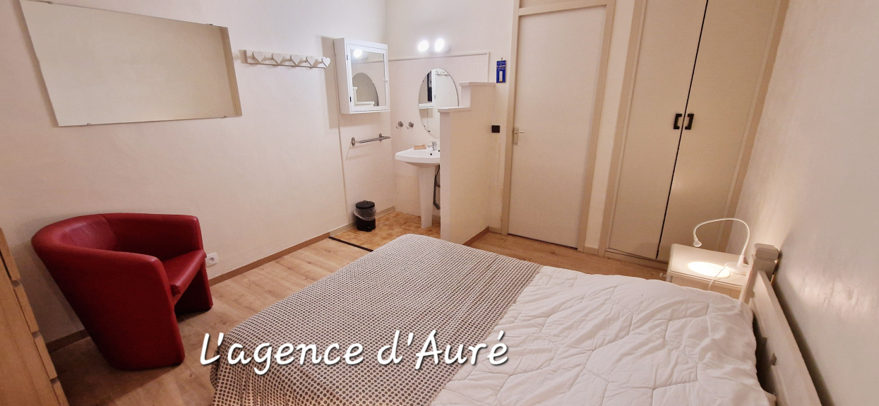 Une chambre avec un lit double (140cm) incluant un espace avec un lavabo.