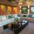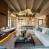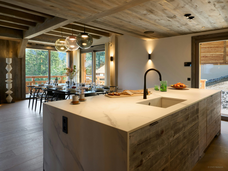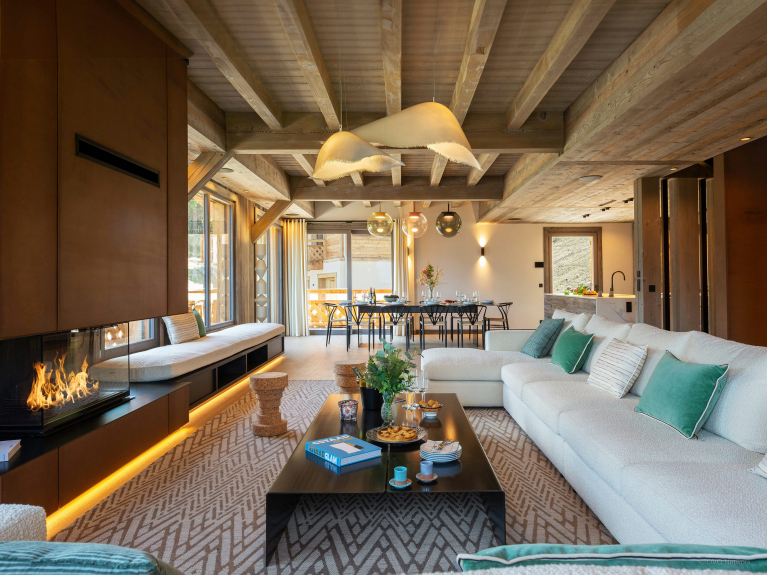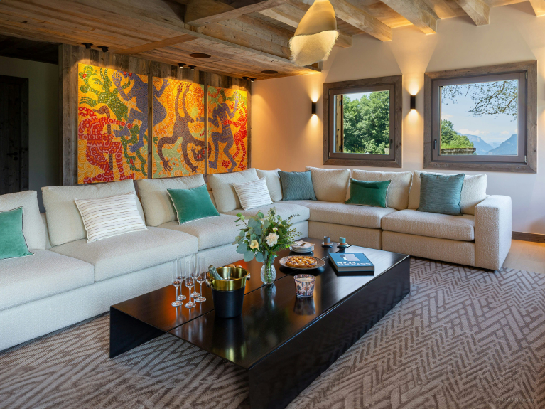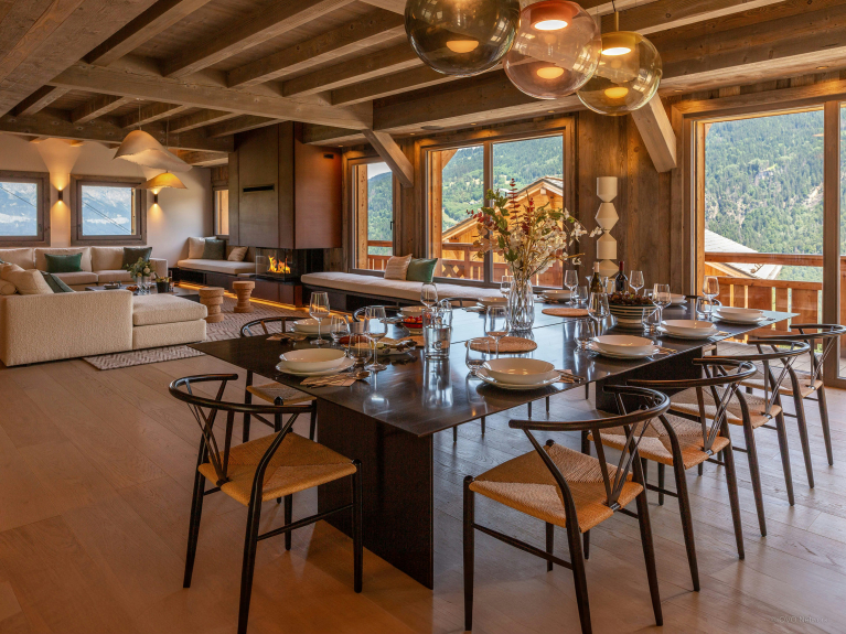 L’étage central est dédié à une impressionnante pièce de vie ouverte, qui comprend notamment une cuisine tout équipée, un comptoir central et une grande table à manger. Un immense canapé modulaire est installé face à la cheminée, et des bancs encastrés près des fenêtres permettent de se décontracter tout en profitant de la vue. Des portes-fenêtres ouvrent sur un balcon.