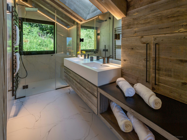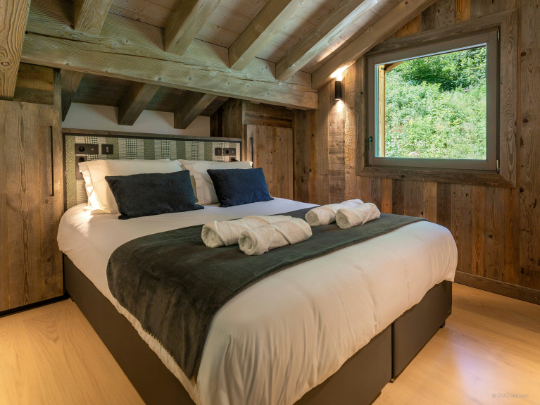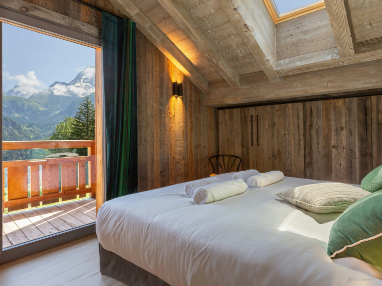 L'étage du haut compte trois chambres doubles supplémentaires, dont l’une avec sa propre salle de douche, et une autre qui peut être convertie en chambre jumelle. Deux de ces chambres donnent sur un balcon, qui bénéficie d’une vue imprenable sur le massif du Mont-Blanc !