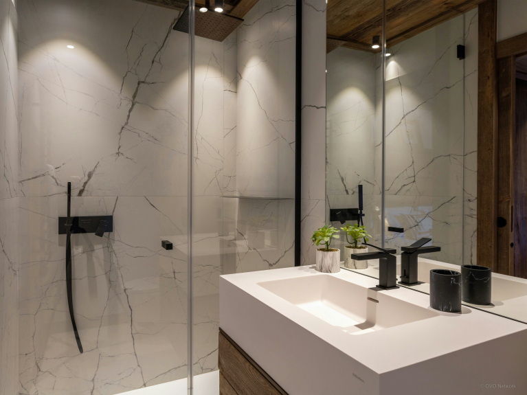 Chacune des trois chambres du rez-de-chaussée comprend sa propre salle de douche privée. Il s’agit de deux chambres doubles et d’un dortoir pour quatre. À ce niveau se trouve également une vaste salle de jeux avec télévision.