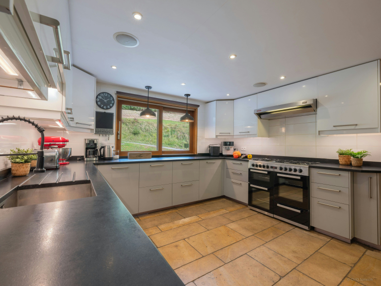Au rez-de-chaussée, la pièce de vie compte un salon disposé autour d’une cheminée, un autre autour d’une télévision, et une grande table à manger pouvant accueillir tout votre groupe lors des repas. Des portes-fenêtres mènent à une terrasse panoramique, où vous pourrez allumer le barbecue, prendre le soleil sur les chaises longues, ou bien vous immerger dans le jacuzzi.
