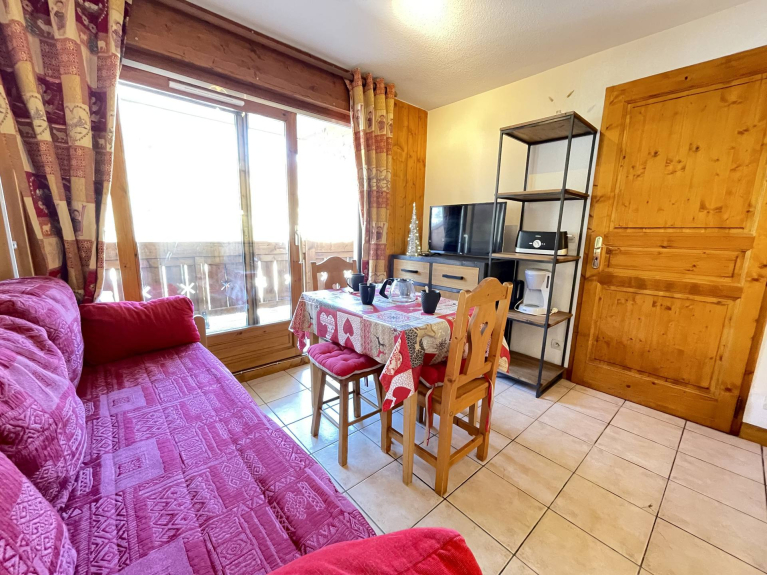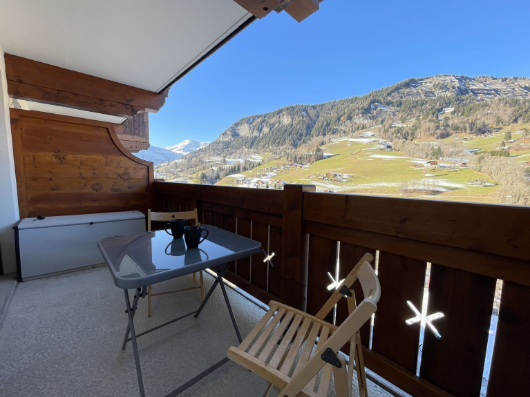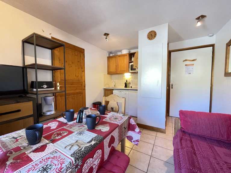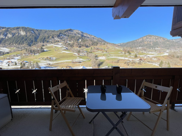 Appartement de deux pièces, au premier étage, d'une surface d'environ 21 m², idéal pour accueillir de 2 à 4 personnes, avec un balcon offrant une belle vue dégagée sur les montagnes.
