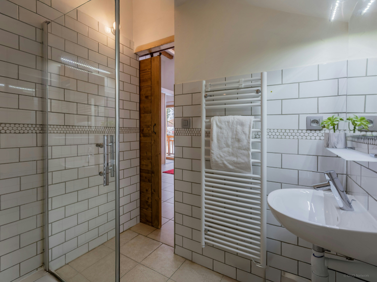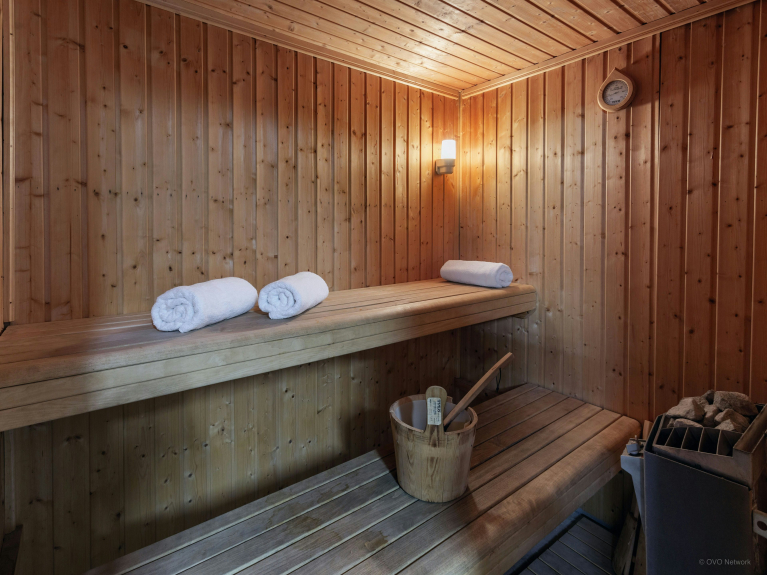 La salle de sport au rez-de-jardin est particulièrement bien équipée en appareils de cardio et de musculation, et compte également une table de ping-pong. Le sauna est évidemment un atout de taille pour un séjour dans les Alpes, et les propriétaires ont pensé à l’accompagner d’une douche. Le local à skis avec sèche-chaussures chauffant et la buanderie équipée sont spacieux et très fonctionnels.