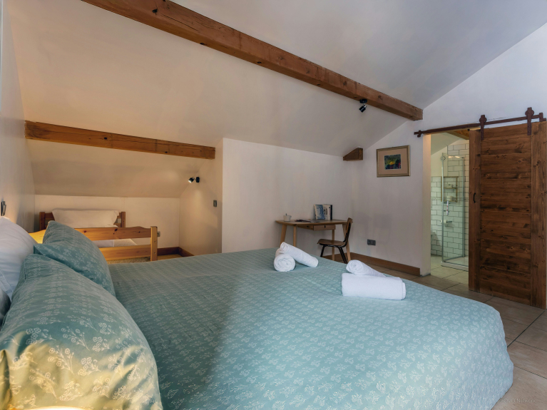 Les chambres sont pratiques et modulables, grâce à plusieurs lits doubles pouvant être configurés en lits jumeaux, et une salle de douche avec toilettes pour chacune d’entre elles. L’unique chambre située au rez-de-chaussée est accessible aux personnes à mobilité réduite, tandis que celles du premier étage comprennent des lits simples d’appoint, ce qui permet d’accueillir des familles avec de jeunes enfants. Ces chambres bénéficient toutes d’un accès à un balcon.