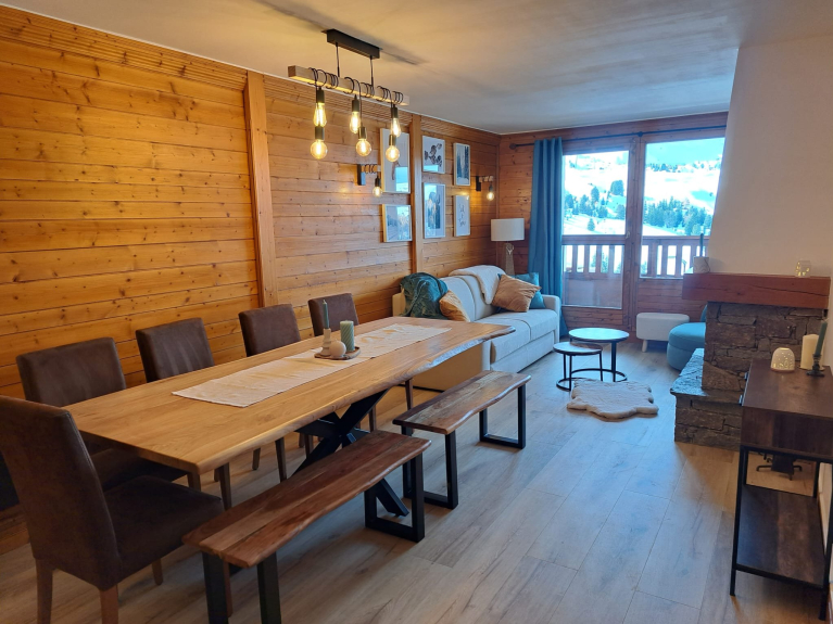 Le séjour est équipé d'une belle table accueillant 10 convives. Il comporte également un coin salon très cosy équipé d'un canapé/lit, tv, cheminée, le tout donnant sur un grand balcon orienté ouest avec vue sur la montagne et son couché de soleil…