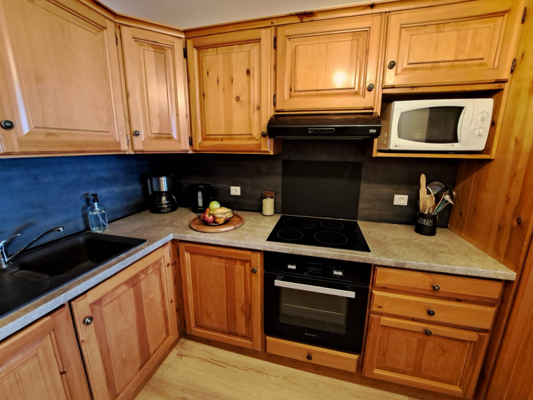 La cuisine est entièrement équipée et ouverte sur le salon. Elle comprend de nombreux placards de rangements, de la vaisselle complète pour 10 personnes, un lave vaisselle, un micro onde, 4 plaques de cuisson électriques à induction, un grand frigo avec compartiment congélateur, un four traditionnel encastré, une machine à café, une bouilloire électrique, un appareil à raclette, un grille pain, …