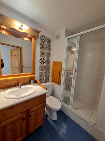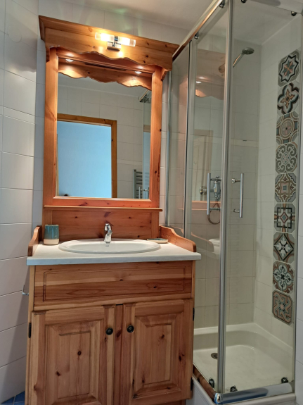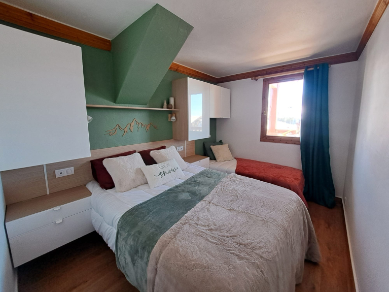 La seconde chambre est équipée d'un lit double de 140x200 et d’un lit gigogne 80X190, avec placard de rangement et salle de bain (douche, wc, sèche serviette), vue sur la montagne.