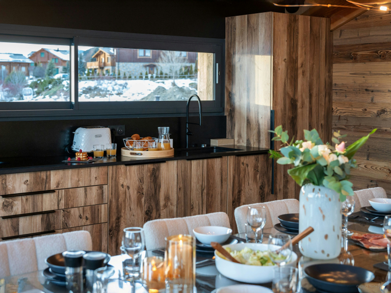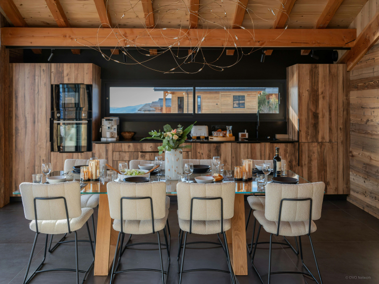 La cuisine entièrement équipée inclut notamment une plaque à induction, un lave-vaisselle, un four à micro-ondes et un robot de cuisine multifonctions. Tout le monde pourra se réunir autour de l'élégante table à manger en verre, ou bien, par beau temps, sur la vaste terrasse meublée.