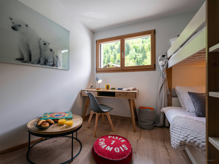Une chambre d’enfants avec lits superposés et bureau se trouve également au rez-de-chaussée, accompagnée d’une salle de douche avec toilettes.