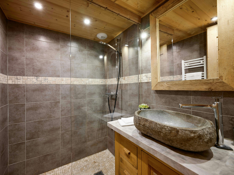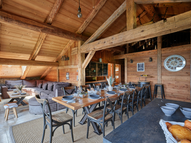 L’intérieur boisé de la propriété est imprégné de l’atmosphère chaleureuse typique des authentiques chalets savoyards. Vous vous sentirez apaisés dès que vous entrerez.