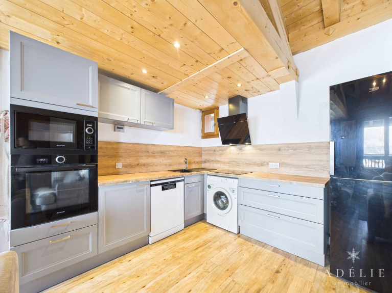 Cuisine ouverte équipée: plaques vitrocéramiques, réfrigérateur, lave-vaisselle, four, micro-ondes, lave-linge