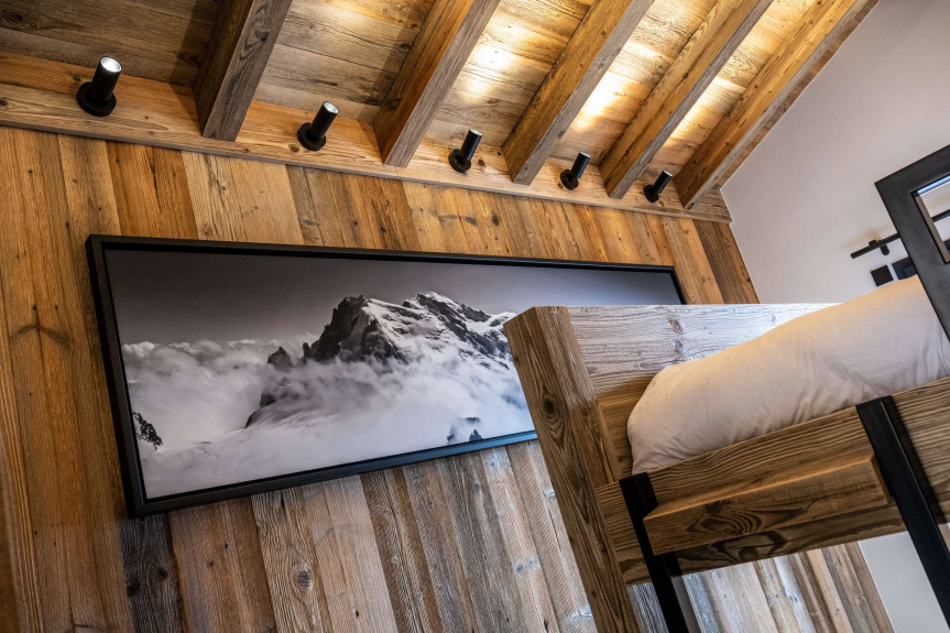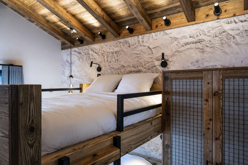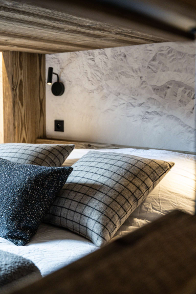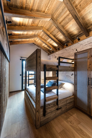 Chambre n°2 (ambiance refuge-cabane) : pour 4 personnes, deux lits superposés sur mesure, salle d’eau adaptée aux enfants.