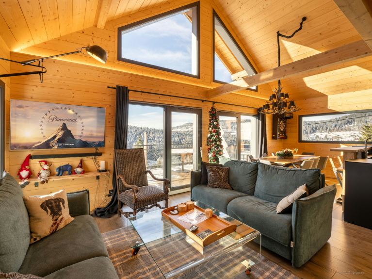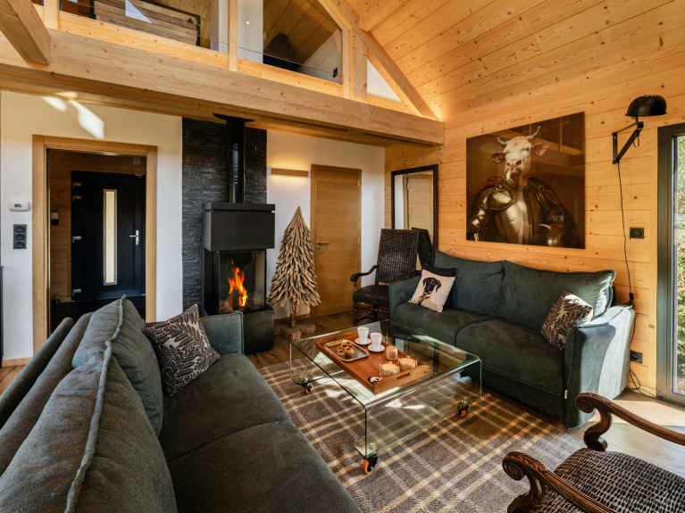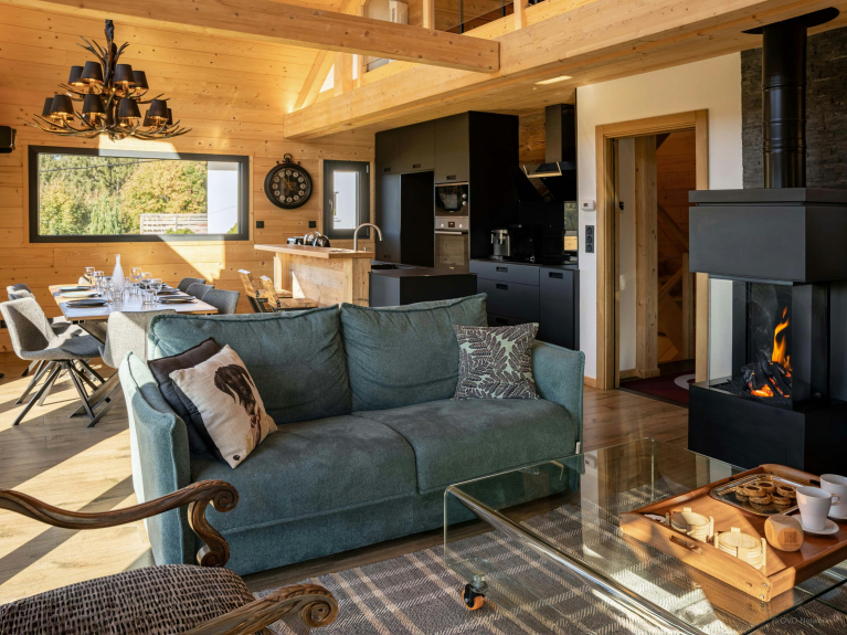 Dès l’entrée, la lumière naturelle inonde la vaste pièce de vie grâce à de larges baies vitrées orientées sud et tournées vers la vallée. Une cheminée à gaz réchauffe l’atmosphère des soirées hivernales.