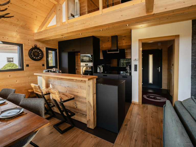 Le salon propose une télévision, et la cuisine au design contemporain s’ouvre sur une table à manger conviviale. Cet étage mène également à une terrasse panoramique, où une deuxième table permet de savourer la sérénité du paysage des Vosges.