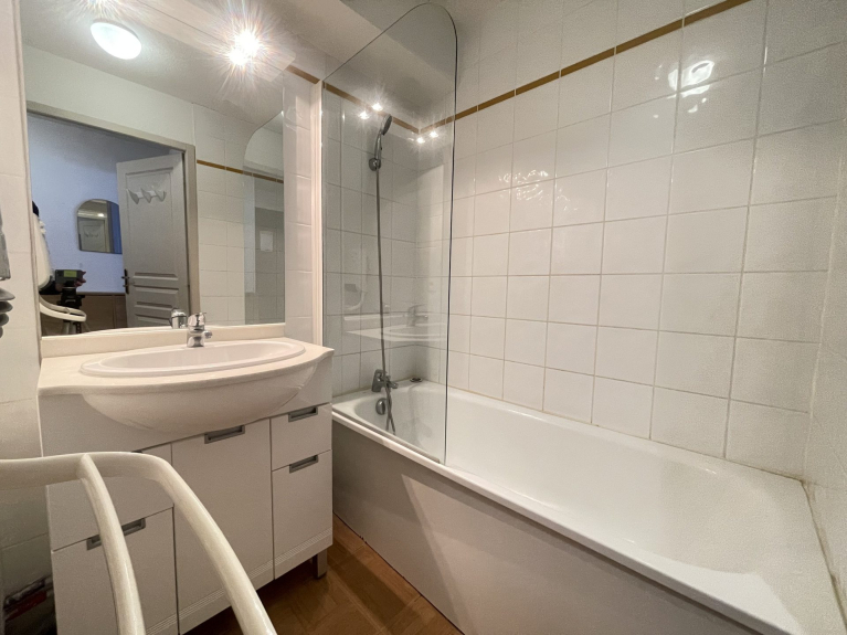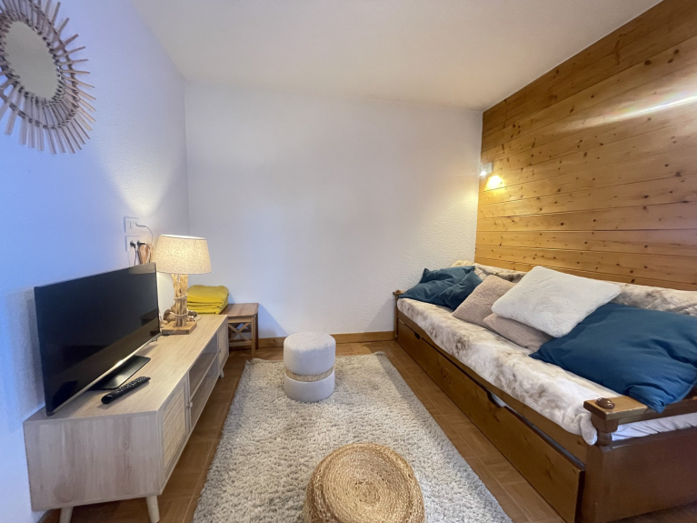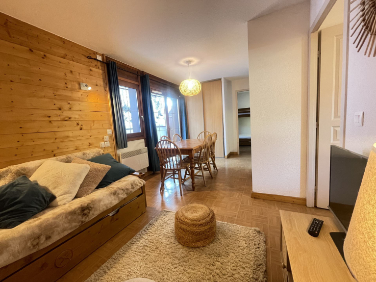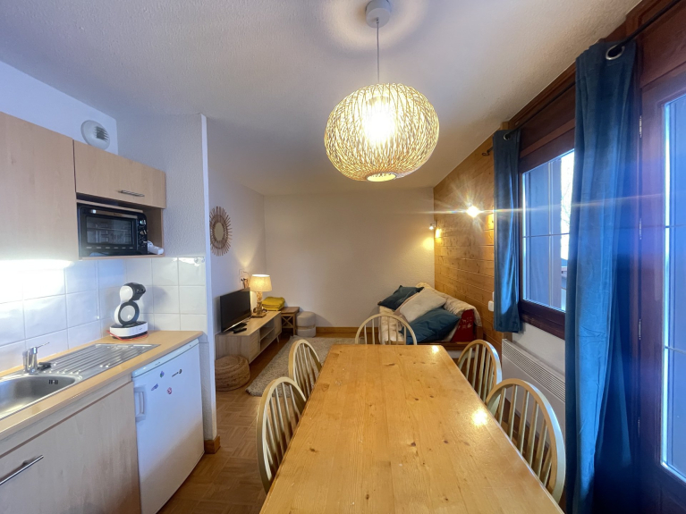 NOTRE AVIS : Appartement confortable et idéalement situé au pied des pistes, avec une grande terrasse ensoleillée et un accès à la piscine intérieure : un choix parfait pour un séjour pratique et agréable à la montagne.